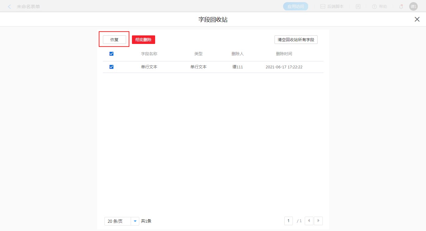 在控件回收站中,选择要恢复的字段所在的记录,点击【恢复】按钮,即可将删除字段恢复到表单中。