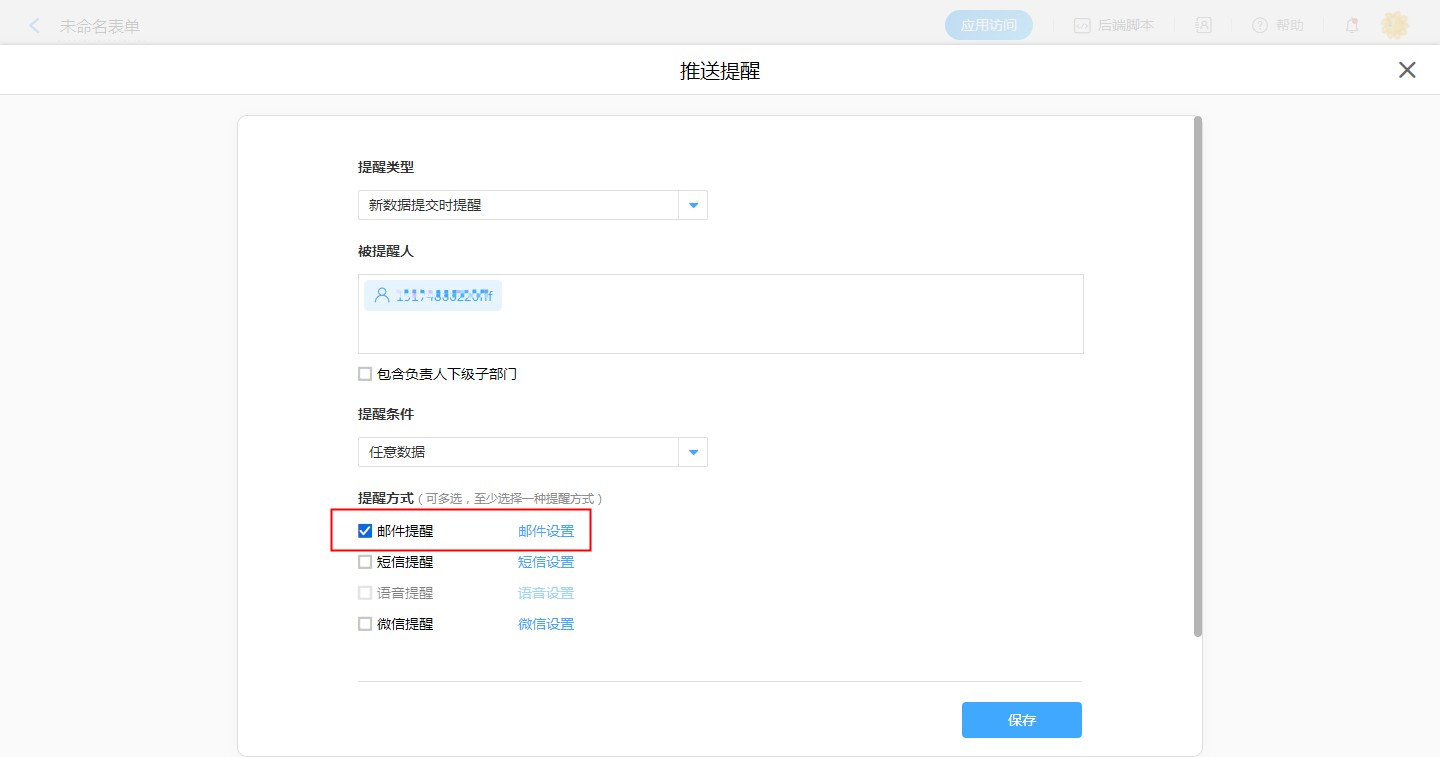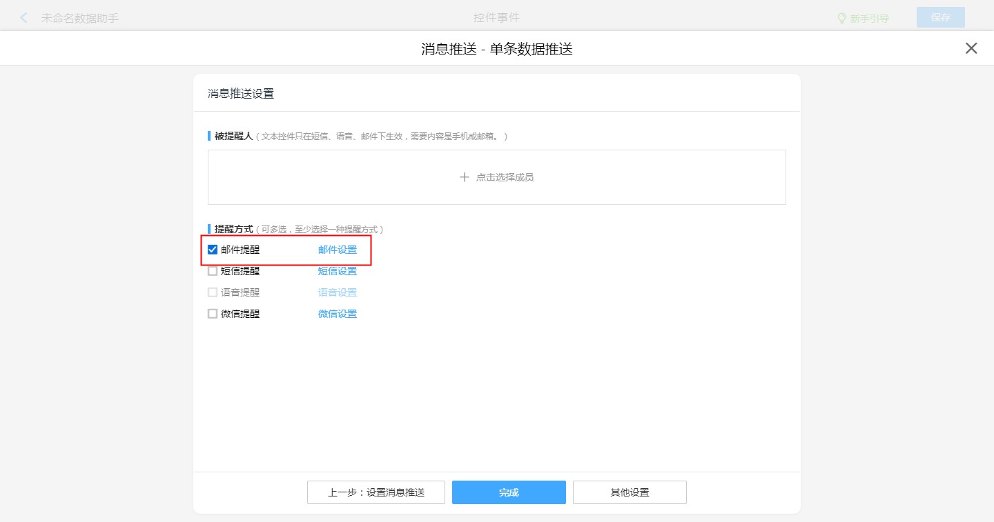 【普通表单设计】-【表单设置】-【消息推送】-【新建消息推送】-【邮件提醒,邮件设置】