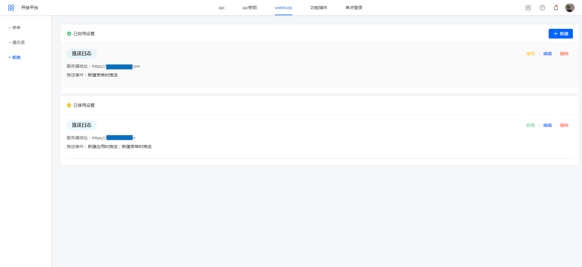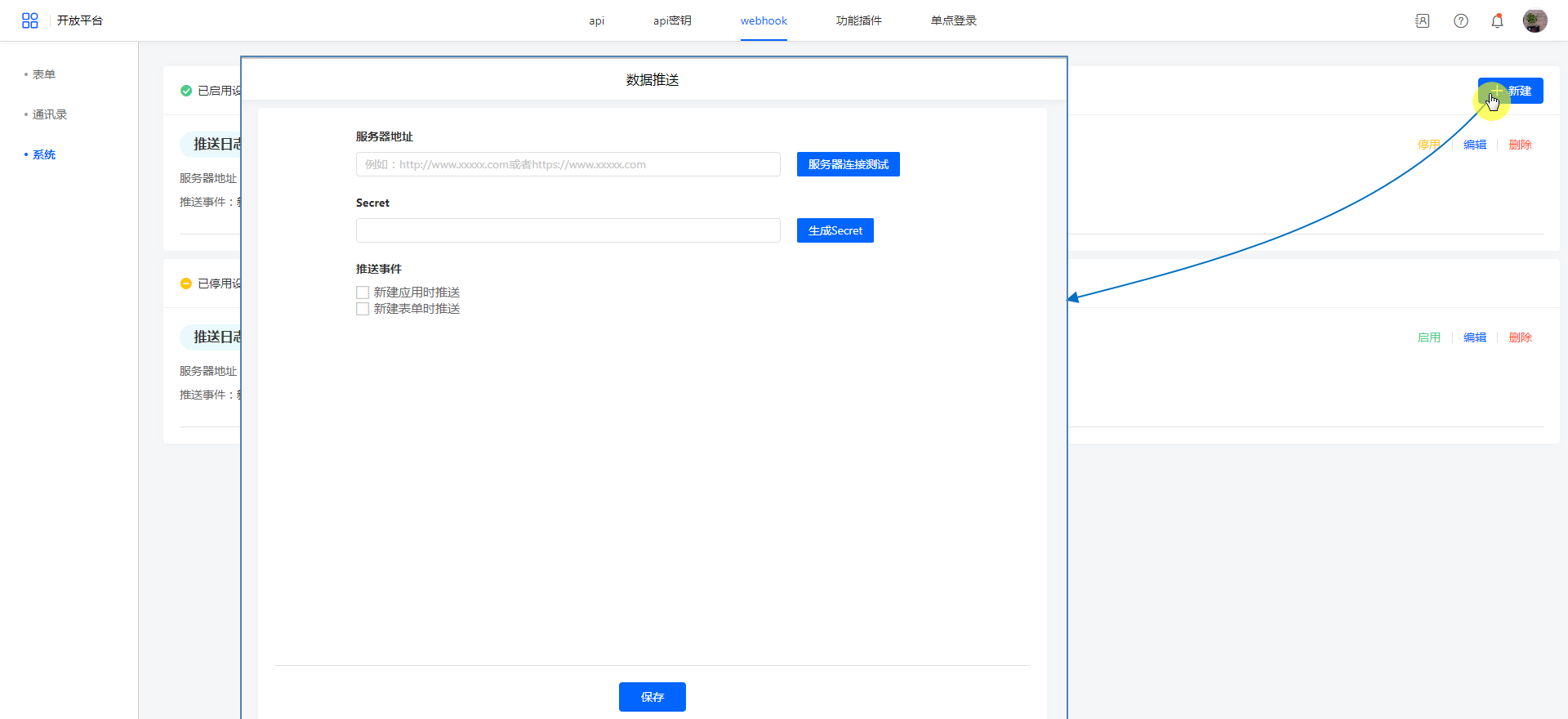 在系统中新建应用和新建表单时,将操作与变更后的数据推送至目标服务器。
