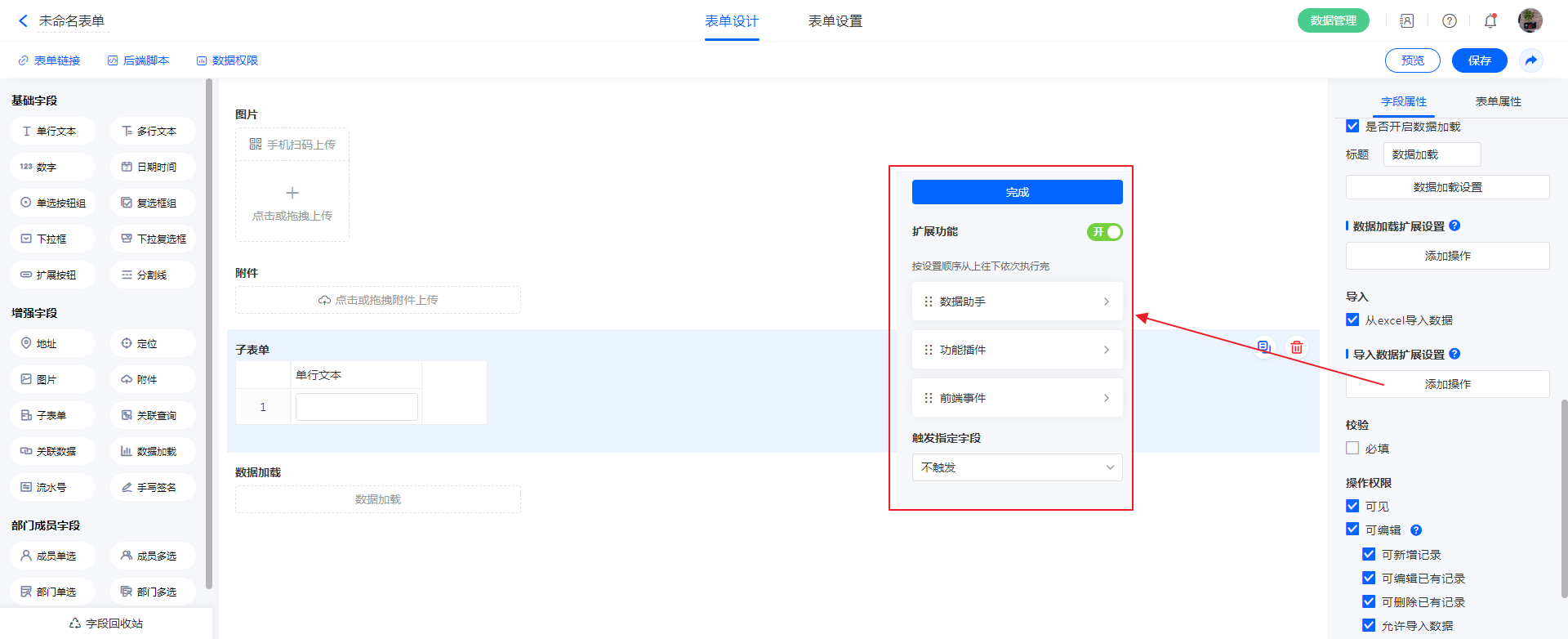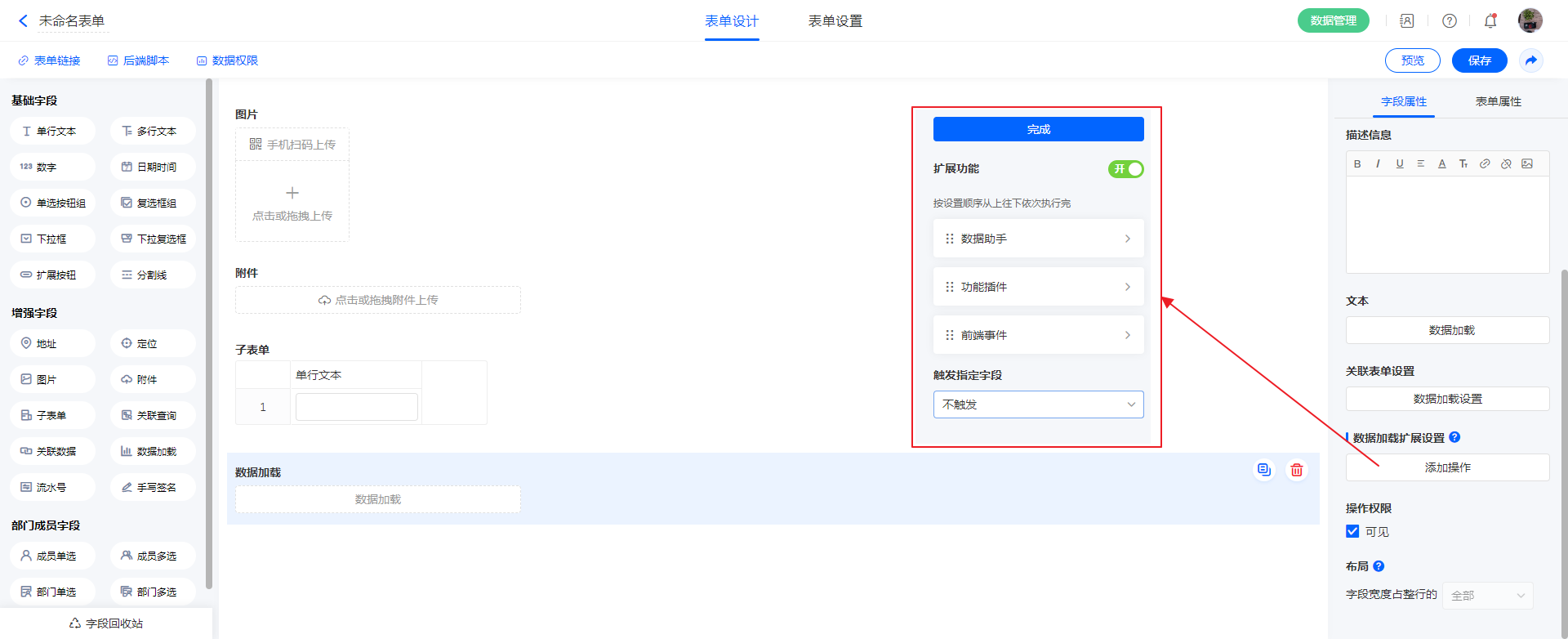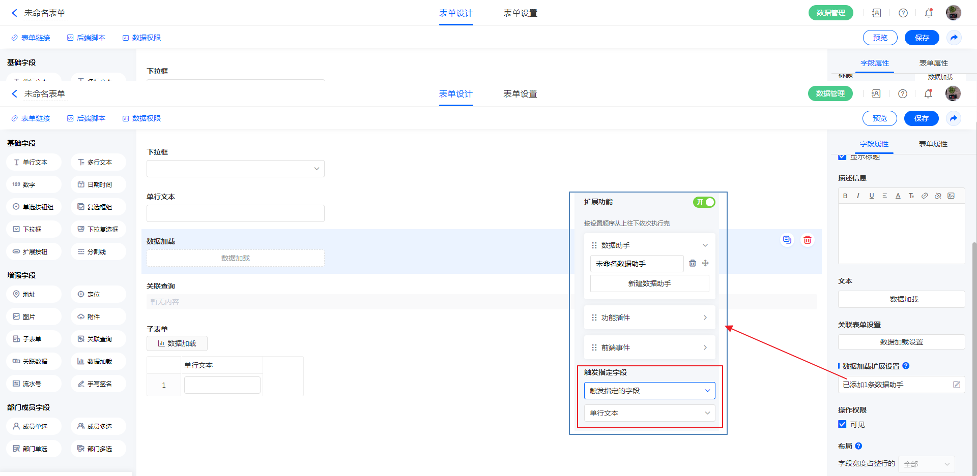 数据加载/子表单数据加载:表单设计页面—数据加载/子表单数据加载—数据加载扩展设置—触发指定字段
