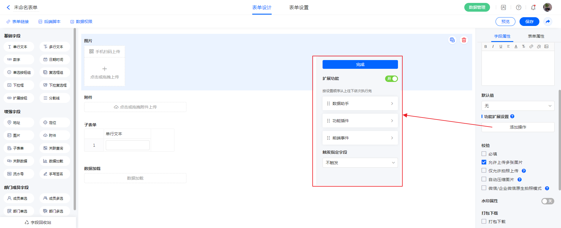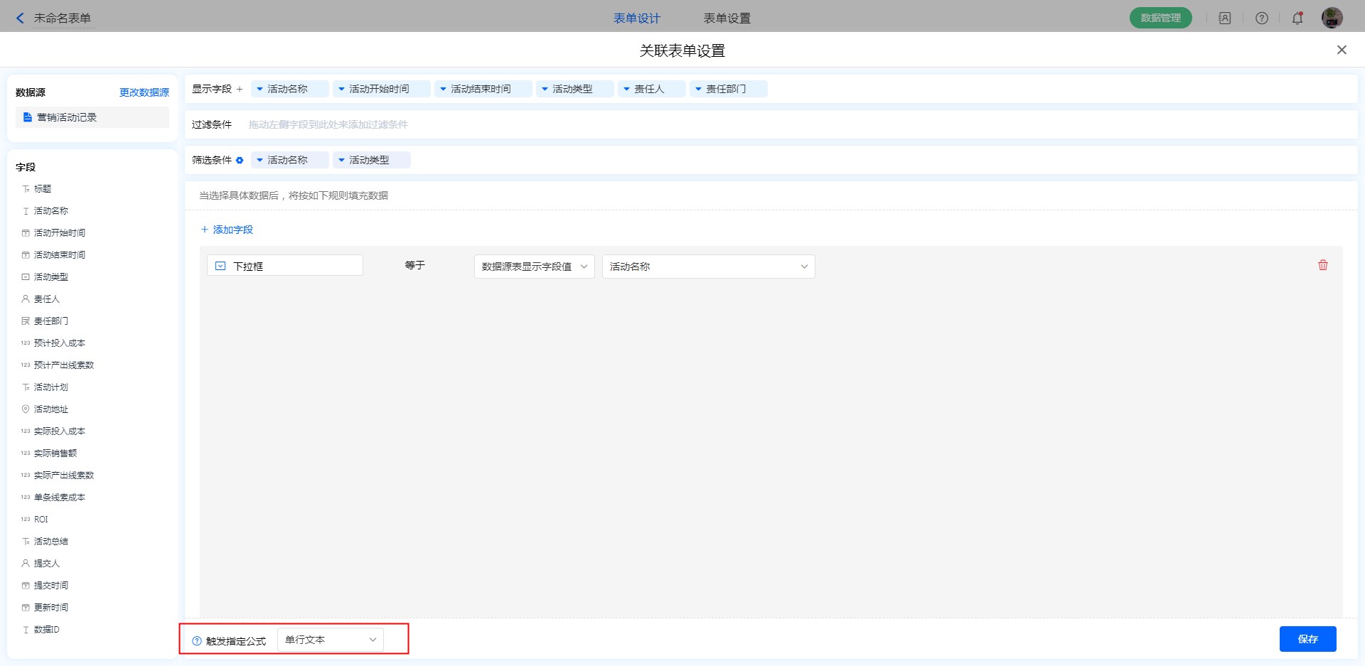 表单控件:表单设计页面—表单控件—功能扩展设置—触发指定字段