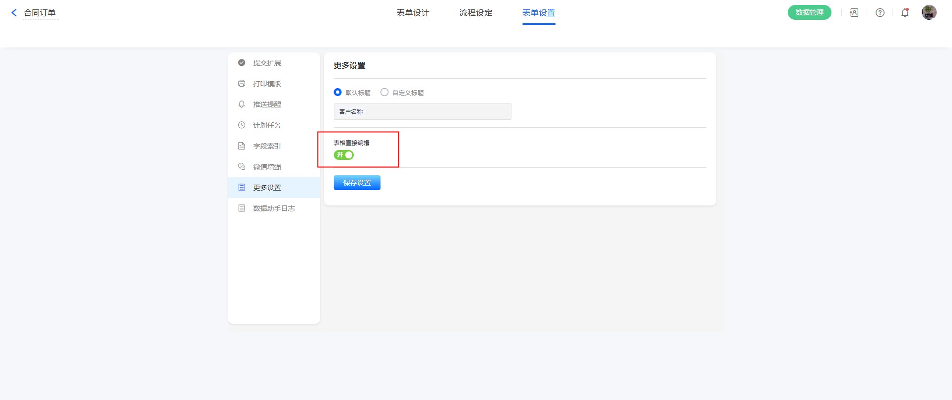 • 表单表格直接编辑设置,在表单设计-表单设置-更多设置中,新增【表格直接编辑】开关;关闭后,数据管理表格不能直接编辑。