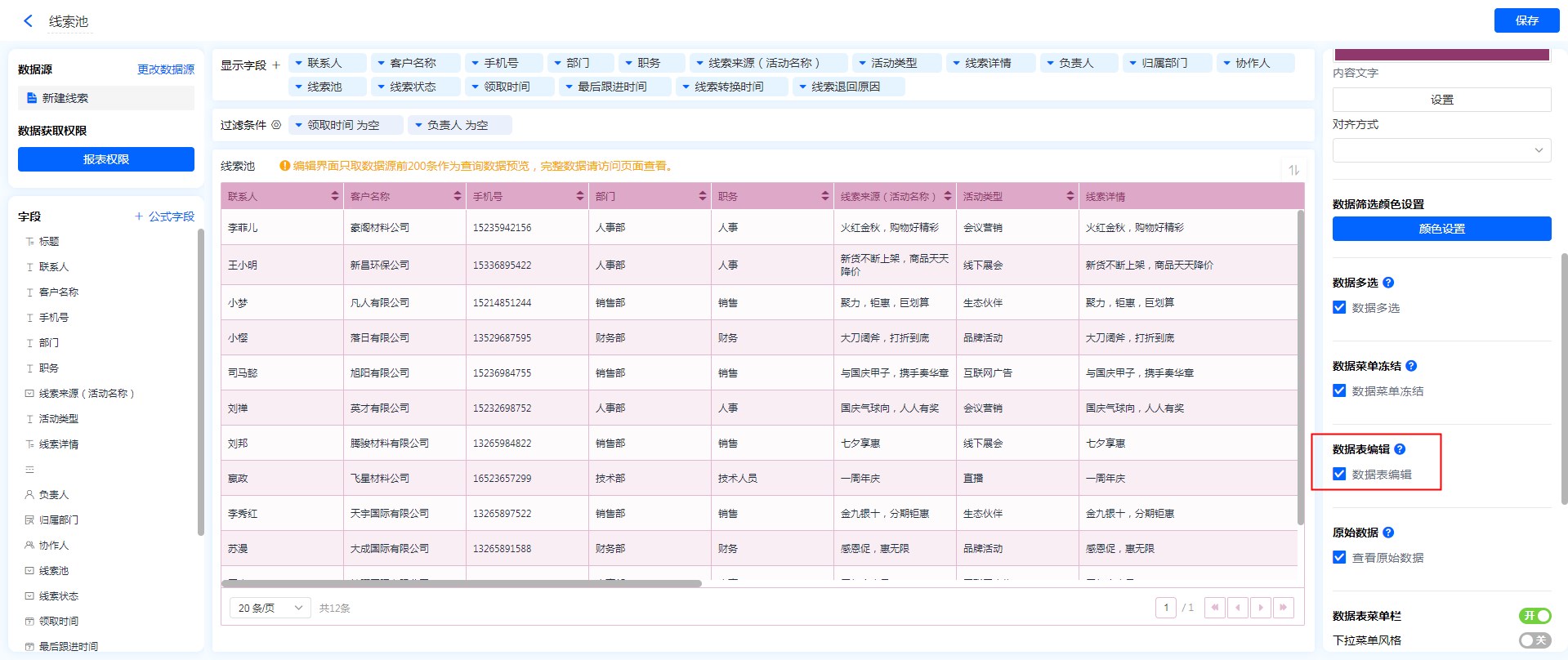 注意:开启表格直接编辑开关后,表格中才会显示按钮控件。