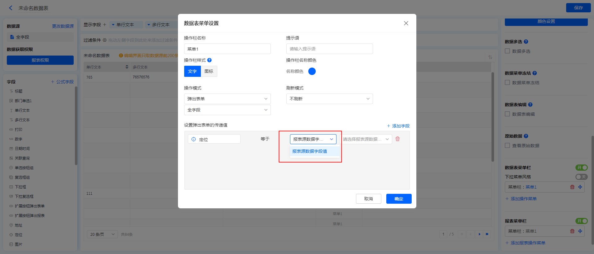 • 报表菜单弹出表单,字段赋值时,不支持设置定位字段。