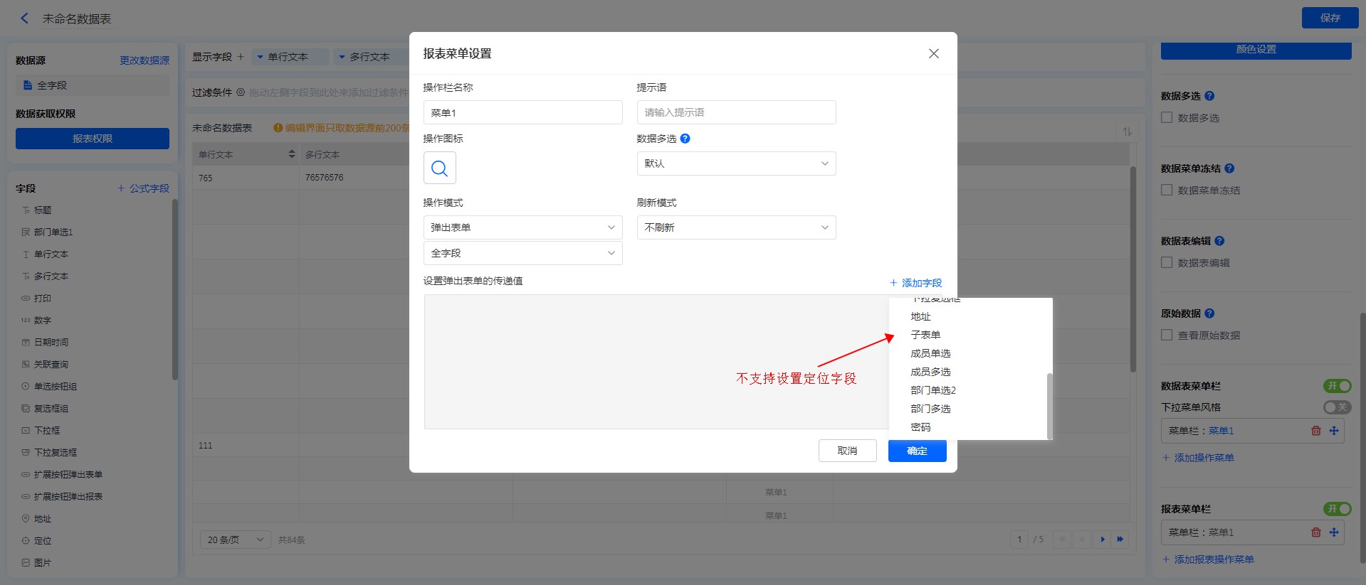 • 数据表菜单弹出表单,字段赋值时,定位字段不支持自定义赋值。