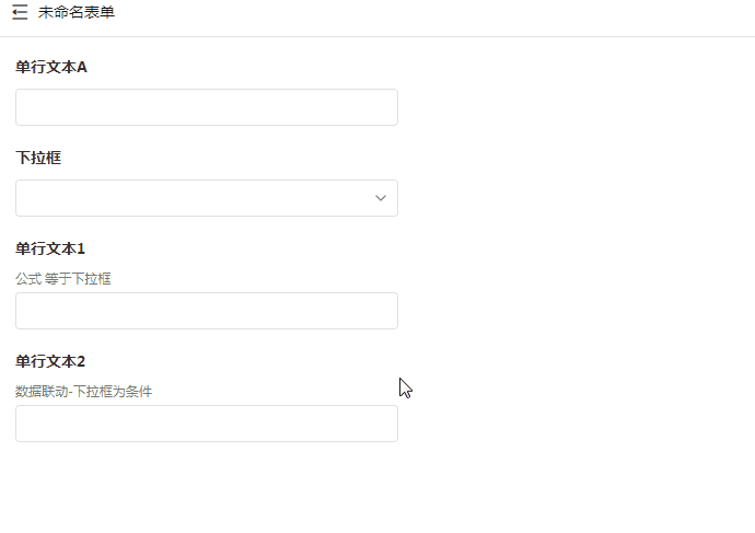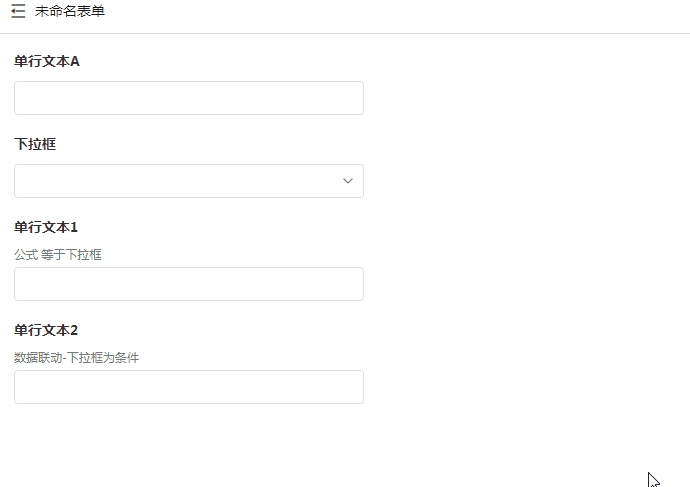 • 单行文本A,功能扩展设置触发指定字段为:不触发,只执行单行文本A的扩展修改下拉框字段的值,不会执行单行文本1和单行文本2字段的公式联动。
