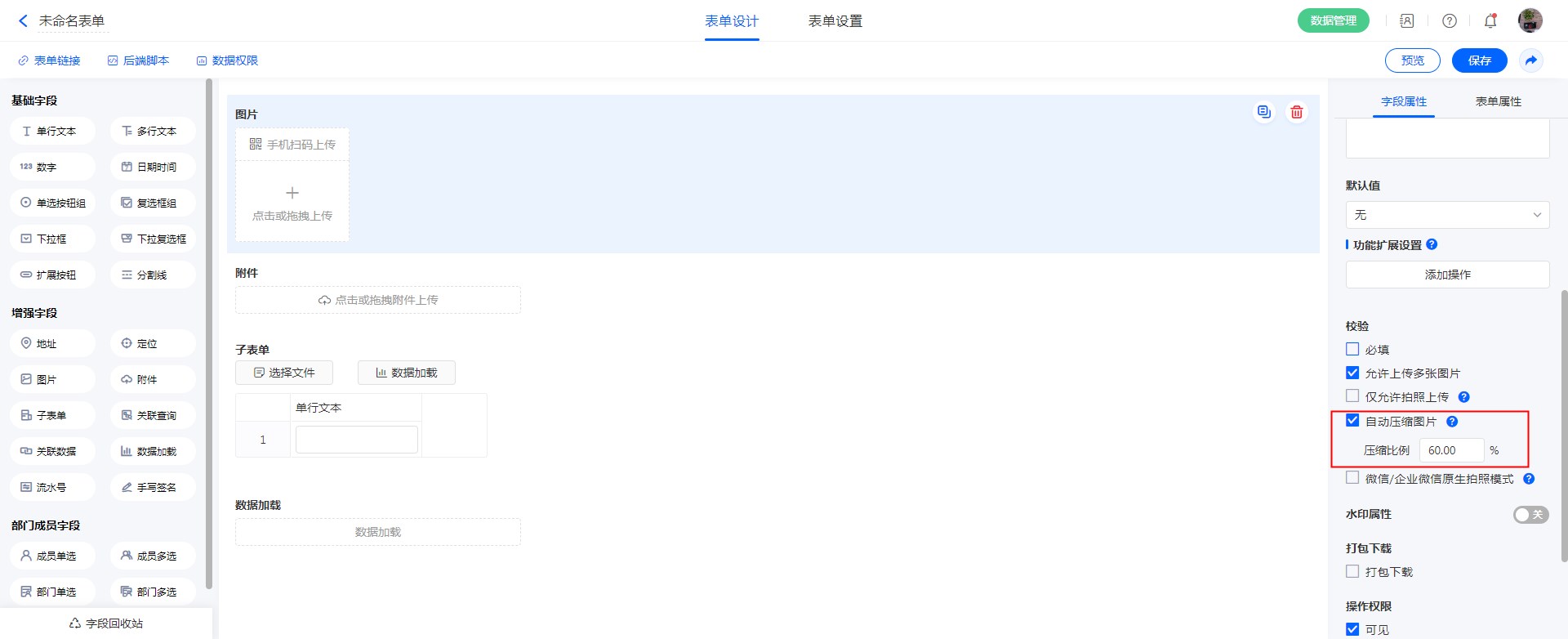 设置入口:表单设计—图片-校验—自动压缩图片,可设置压缩比例