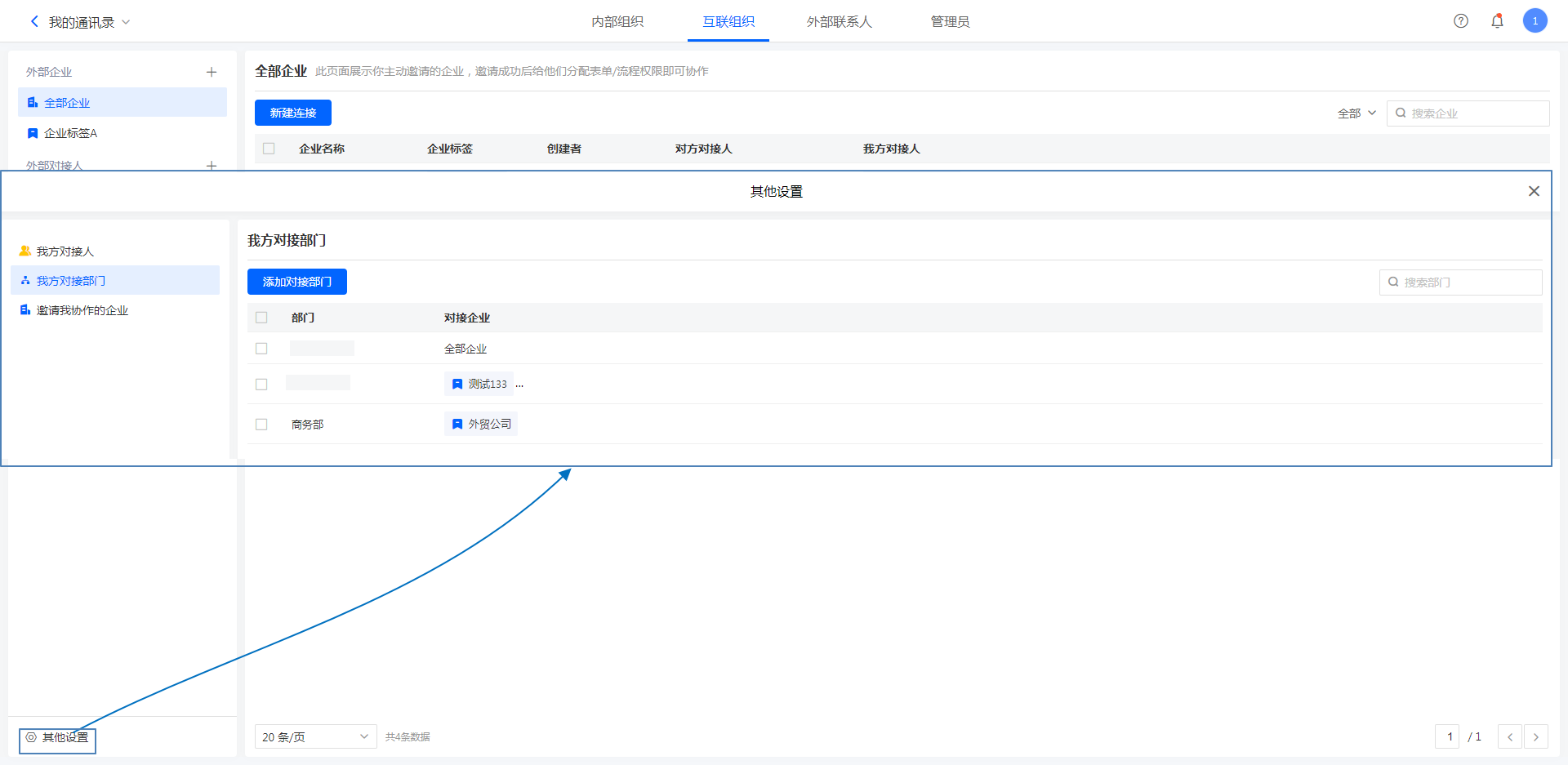 注意:只有内部成员部门可以设置为对接部门,外部联系人分组不可设置为对接部门;即外部联系人不参与企业互联的任何业务。