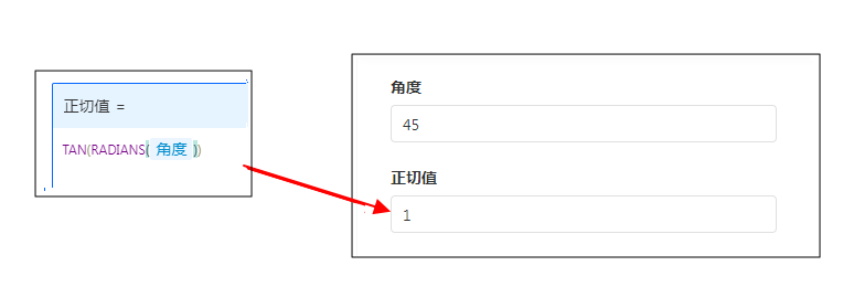 如计算 TAN(45°) 的值,可设置公式为TAN(RADIANS(45)),返回 1。