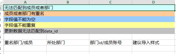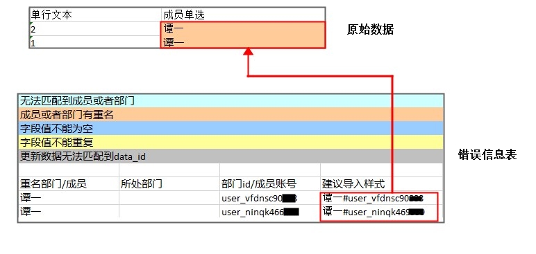 • 成员/部门单选无法匹配、成员的昵称重名、部门名称重名时导入时会提示错误。