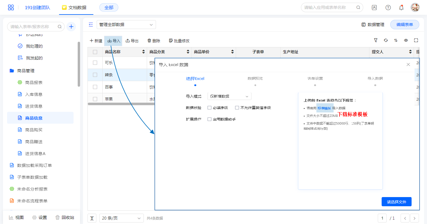 • 导入子表单数据,单行数据不能超过200行。