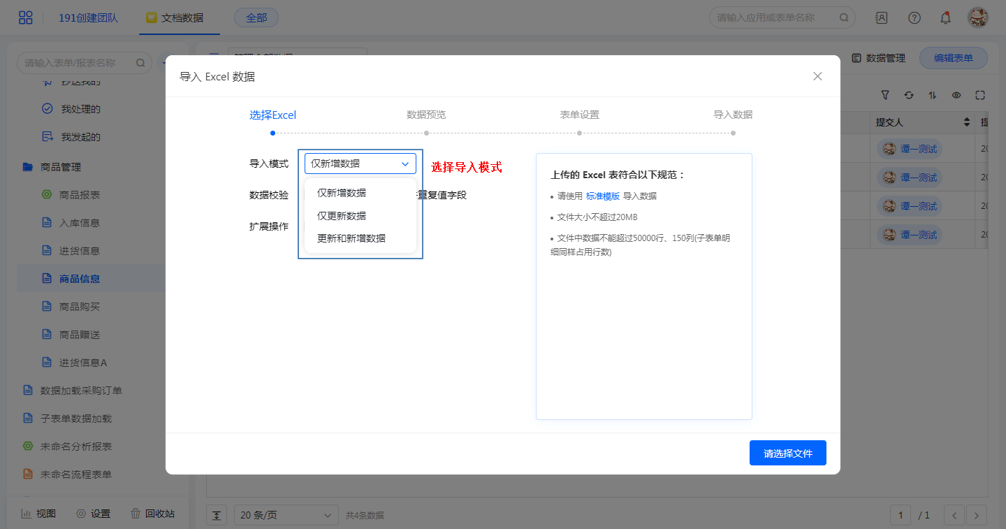 在导入模板前,需根据实际情况选择导入模式。