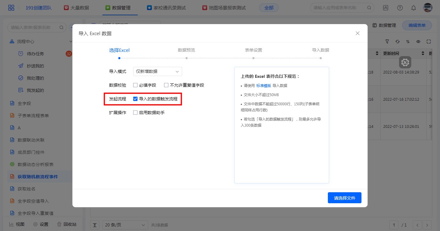 • 若勾选「导入的数据触发流程」,则最多允许导入300条数据。