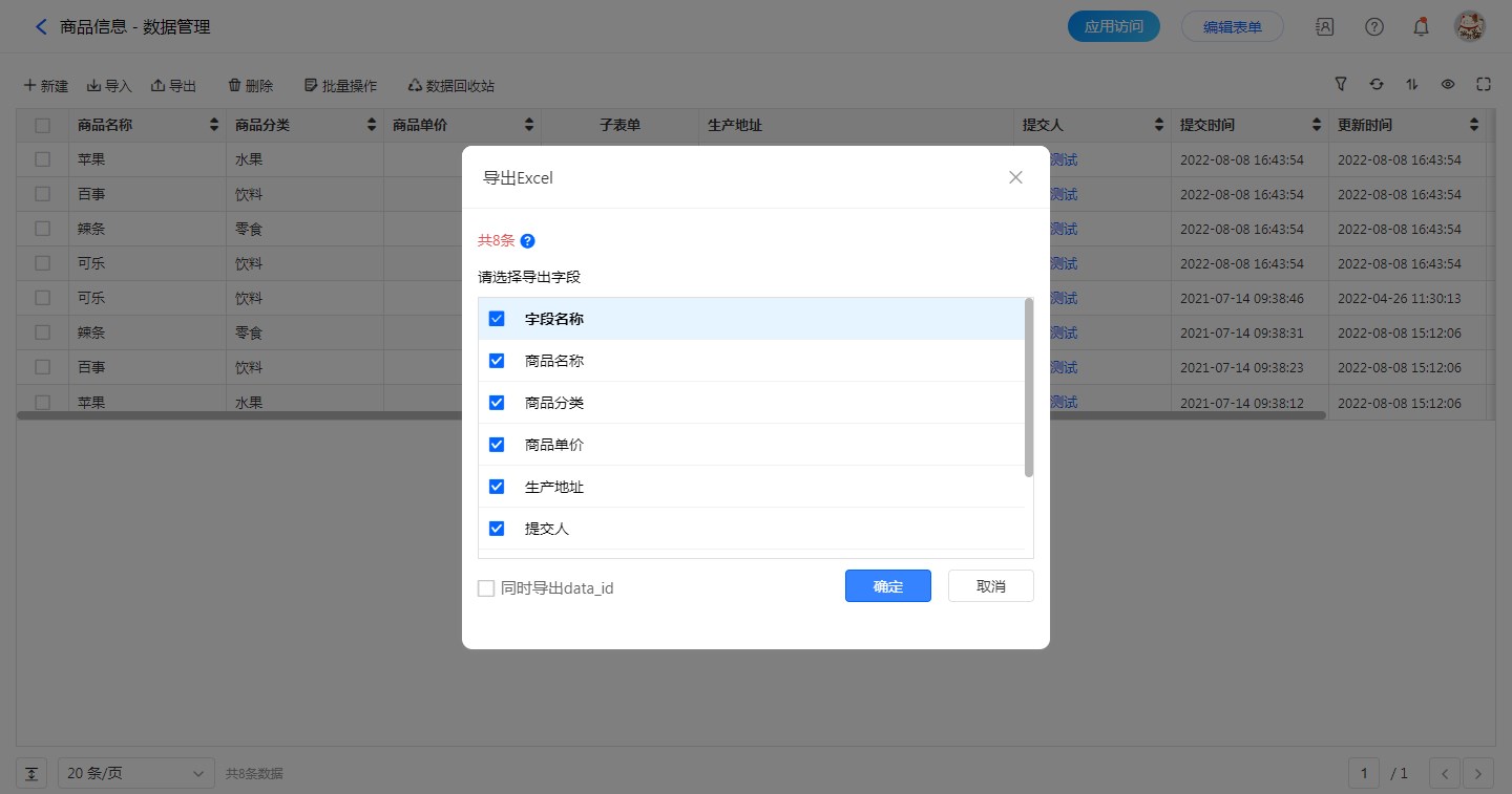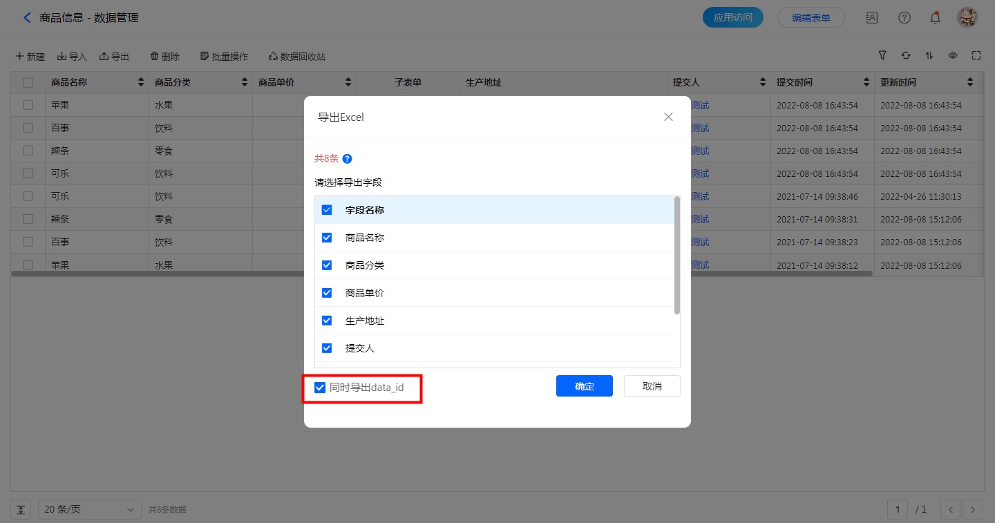 当将表单中的数据导出并修改后,希望再次导入时只更新excel中修改的值时,可在导出数据时勾选【同时导出data_id】。
