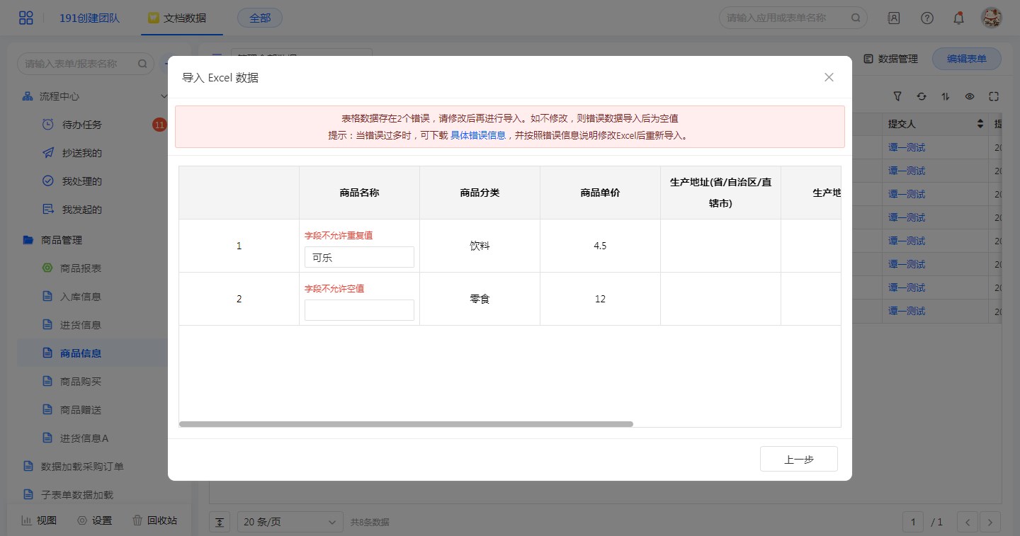 在表单中导入数据时,会出现错误提示,然后在该页面下载「具体错误信息」。