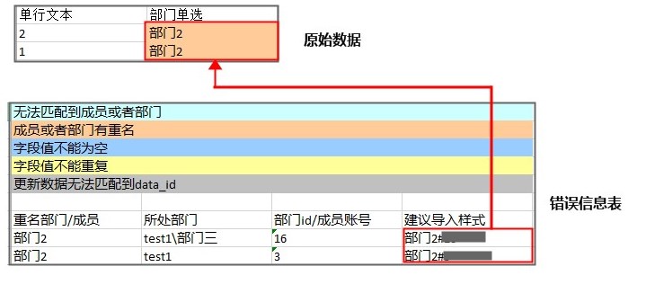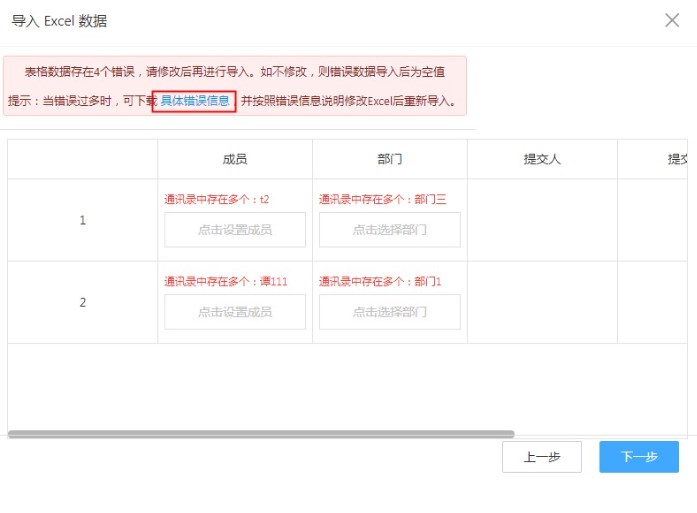 ​ 当通讯录中成员部门名称重复或者在通讯录找不到时,会自动检测出来,此错误可以忽略直接导入数据,导入数据中成员部门字段为空