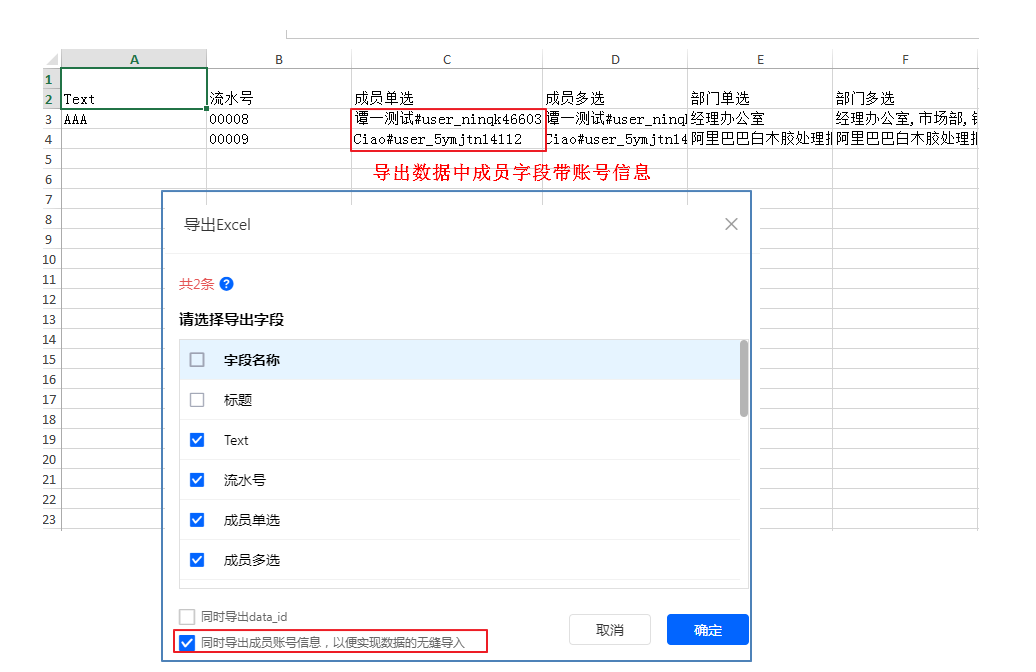 勾选后,导出成员字段时会自带账号信息,以便实现数据的无缝导入。