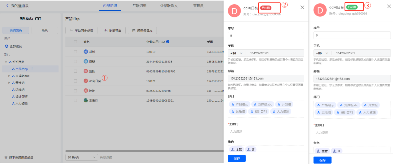通讯录中,支持对成员进行停用与启用。停用的成员不再支持参与企业的业务协作,需要使用的时候可再开启。