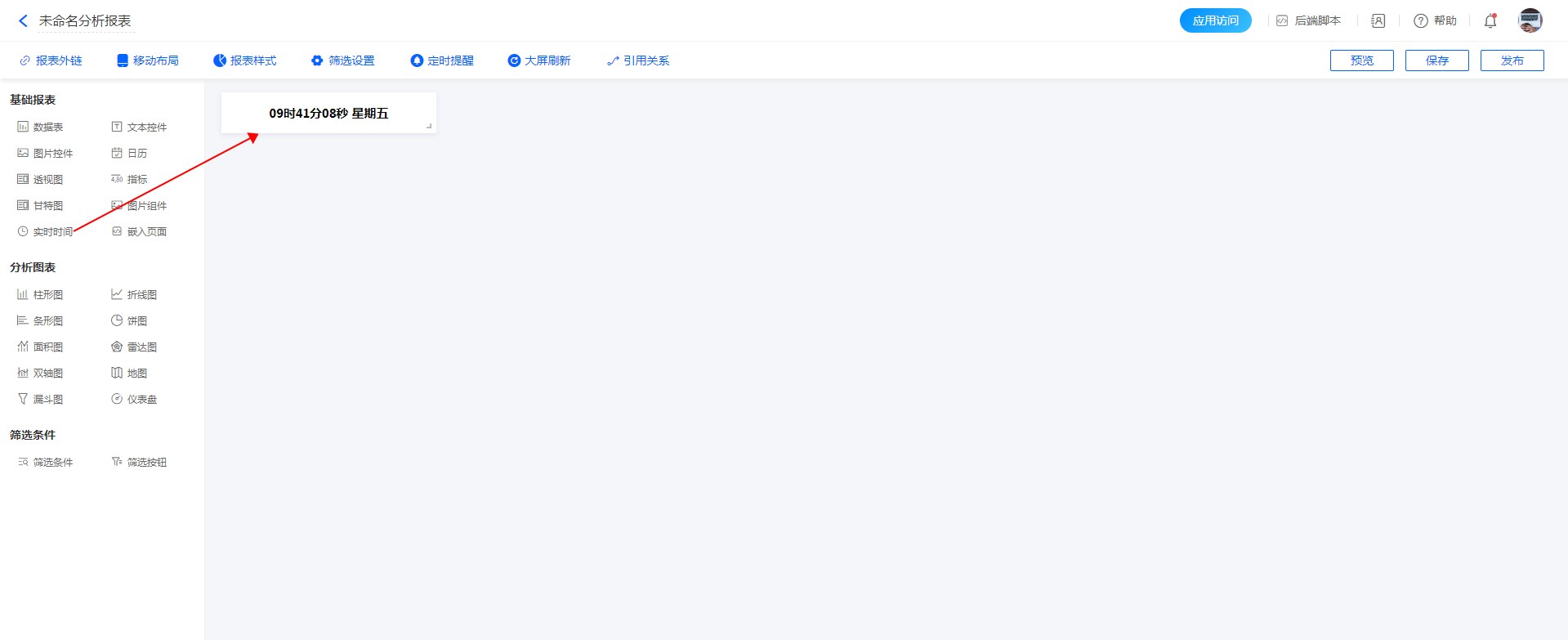 实时时间组件就像放在报表中的一个钟表,可以查看当前的实时时间。