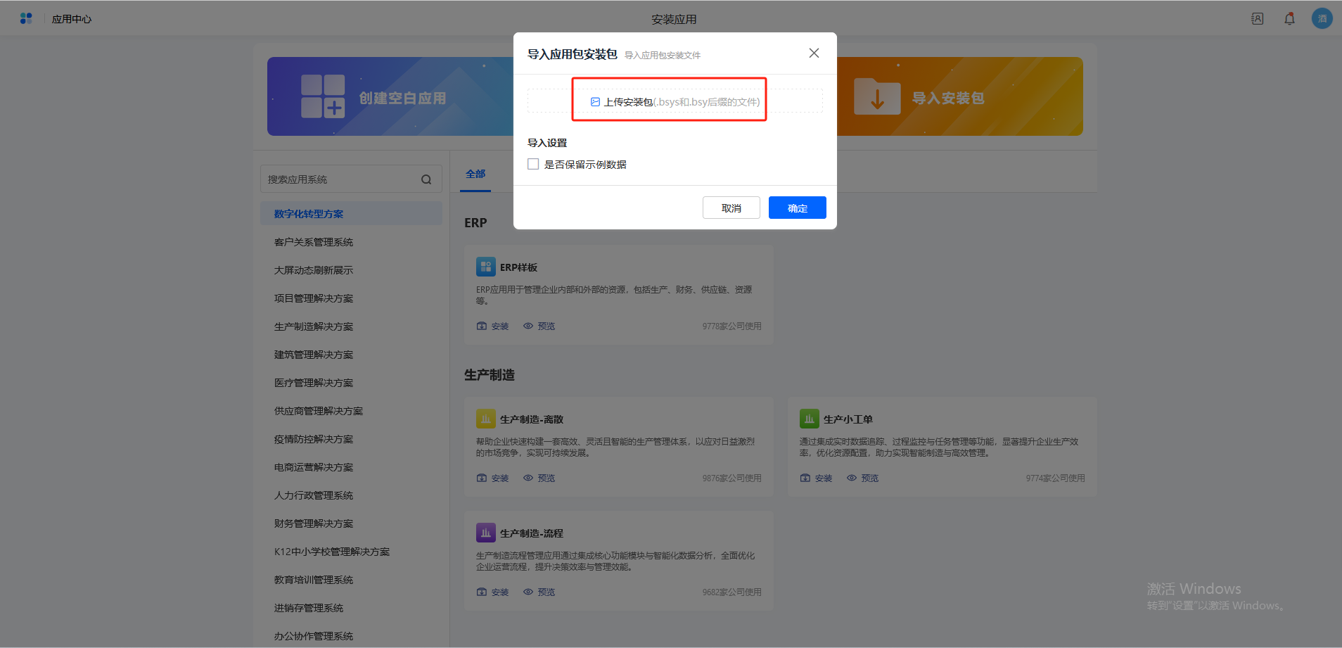 首页,点击新建>>导入安装包,上传下载的标准应用安装包,点击确定 导入成功。如下图所示: