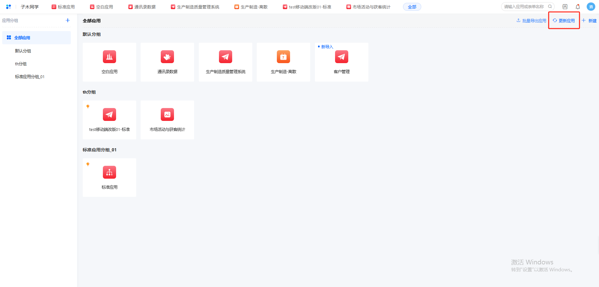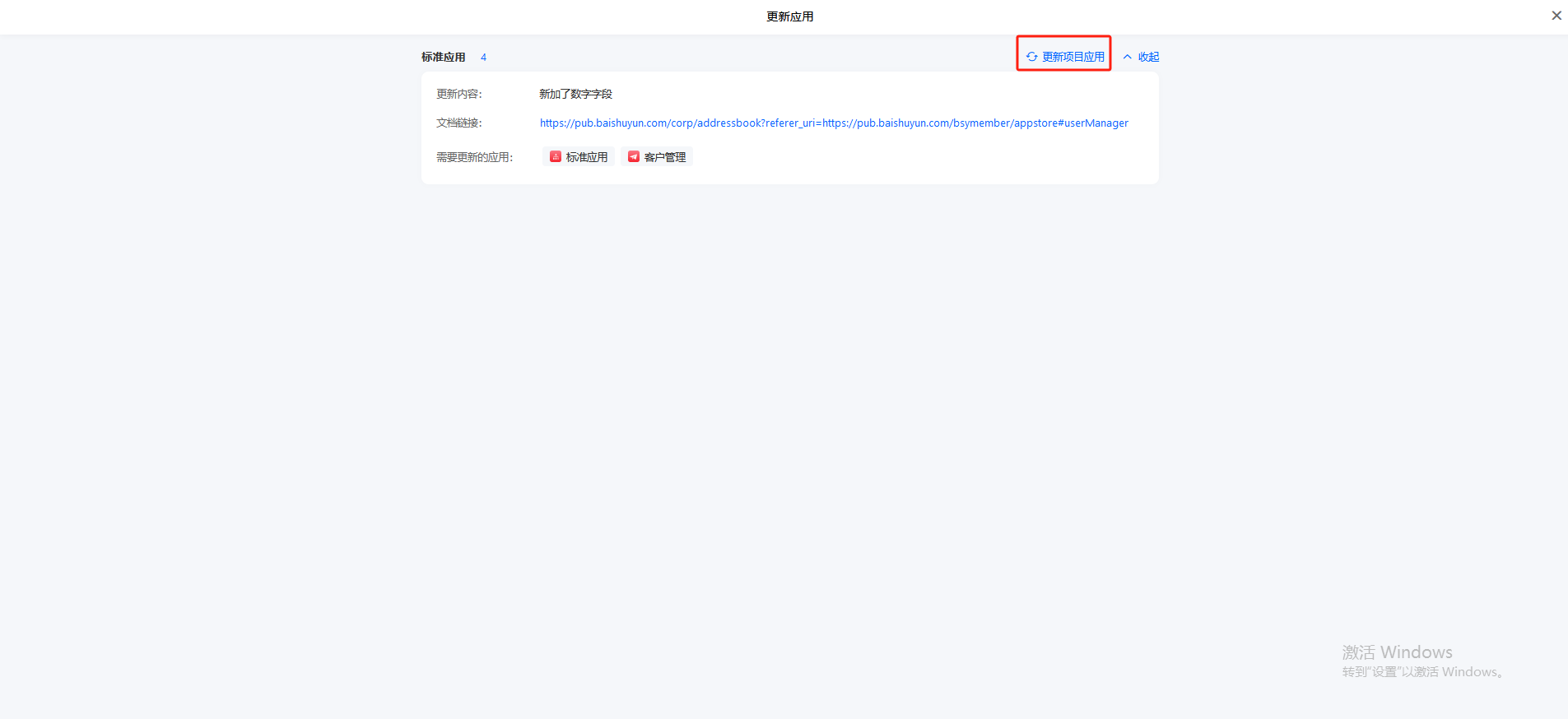 创建者对应用进行编辑,发布了新版本,使用者在工作台首页 显示有应用可更新,点击去更新,可更新项目应用。如下图所示:
