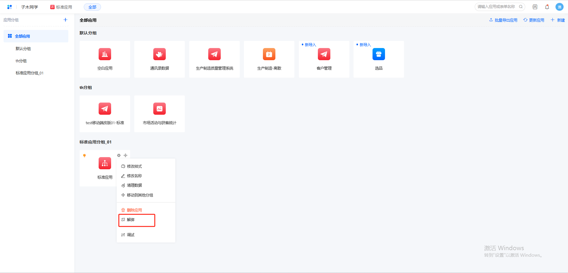 点击安装的标准应用,设置>解绑按钮,输入解绑key 可进行解绑操作,解绑后用户能进入编辑界面进行应用设计和编辑,无法再进行更新操作。如下图所示: