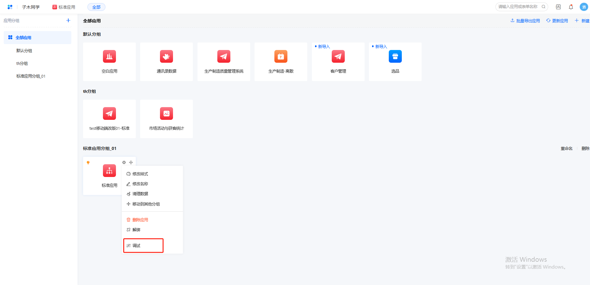 点击安装的标准应用,设置>调试按钮,输入token 可开启调试功能,开启后用户拥有对该应用所有编辑权限。如下图所示: