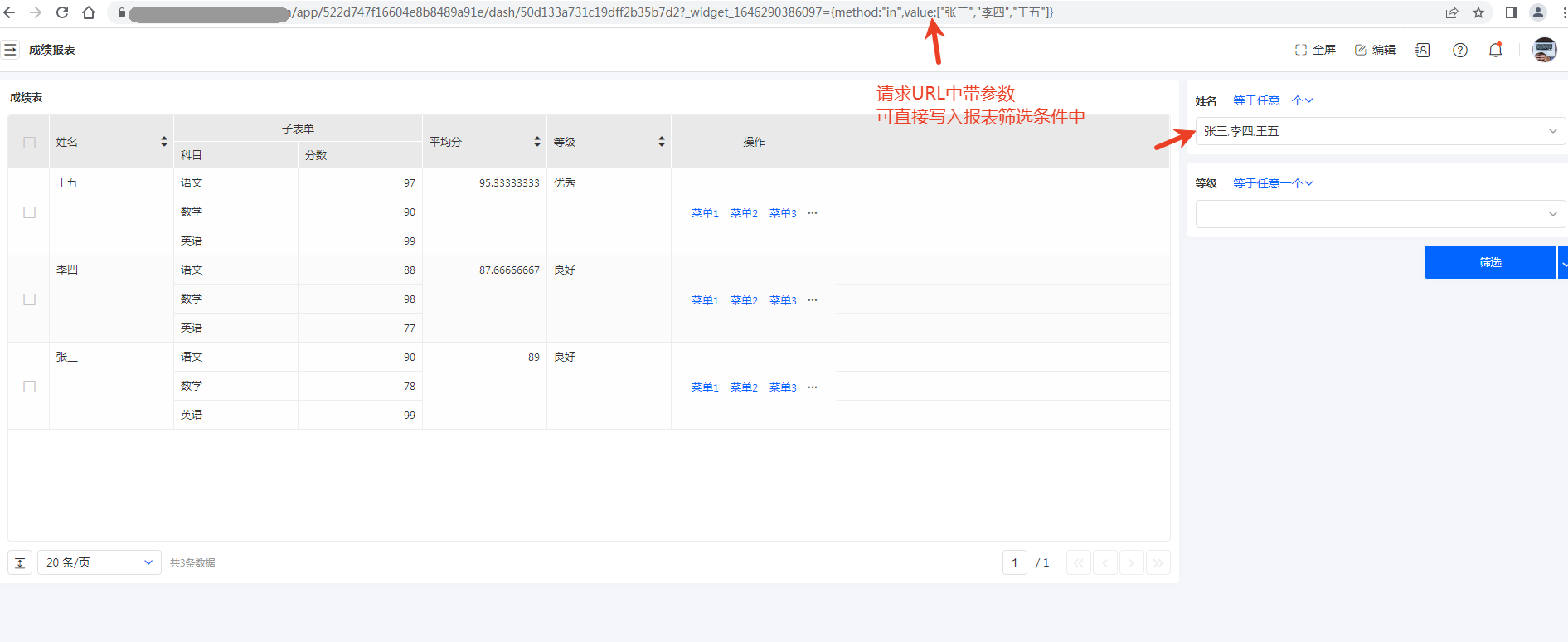 - 卡片报表常规访问:https://abc.net/team/app/5a64953530d237ecafa7c0bc/scenes/5e3c0c0138bc43c99213f7ee?widget_1766112065326={method:"range",value:[1,100]}&_widget_1766112065322={method:"in",value:["张三","李四","王五"]}