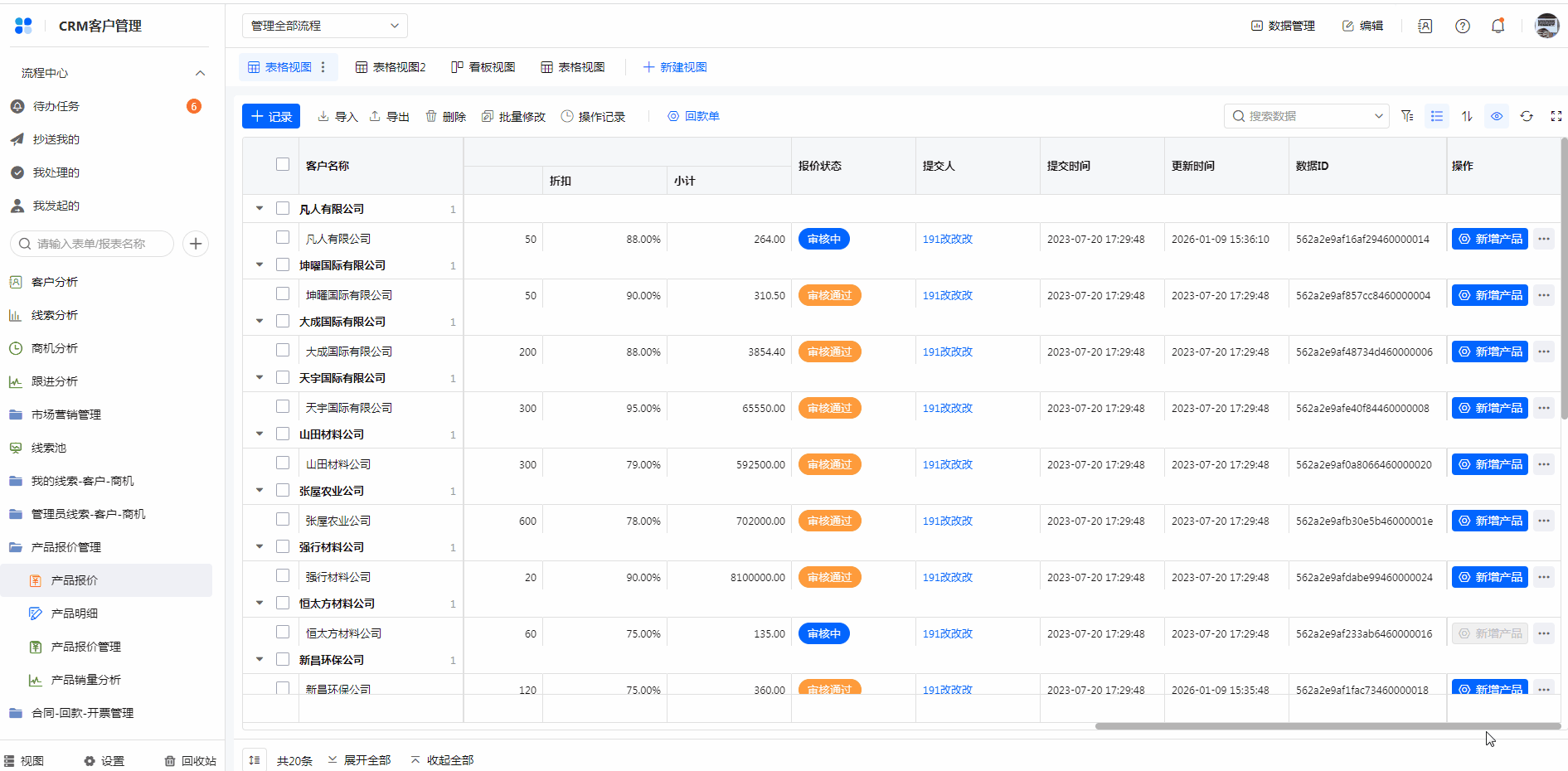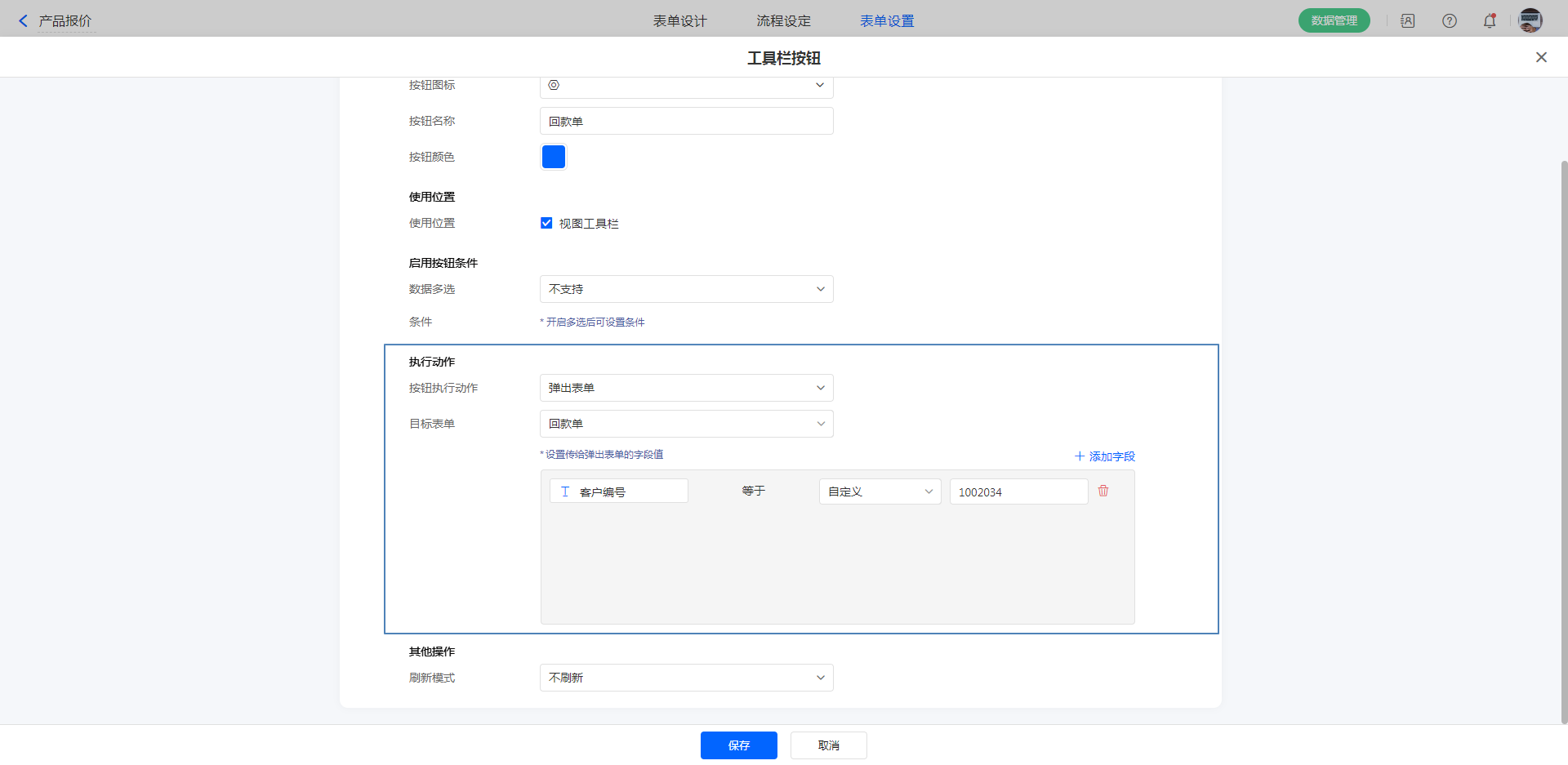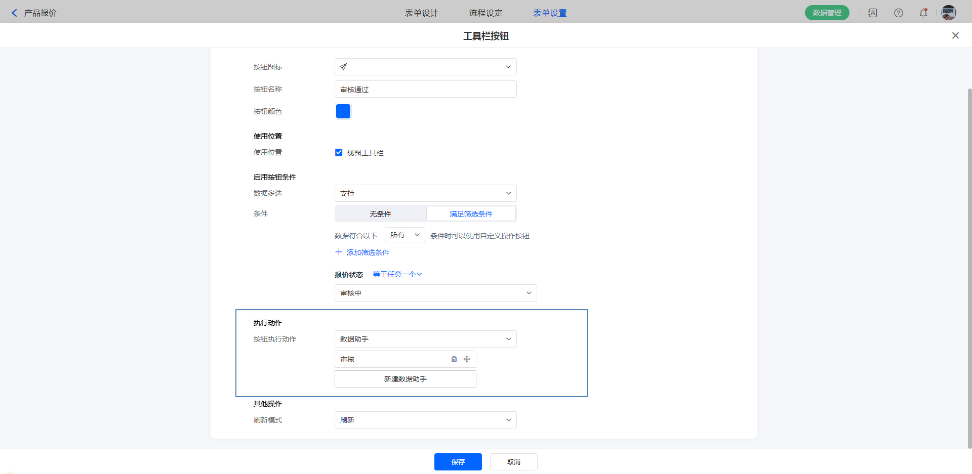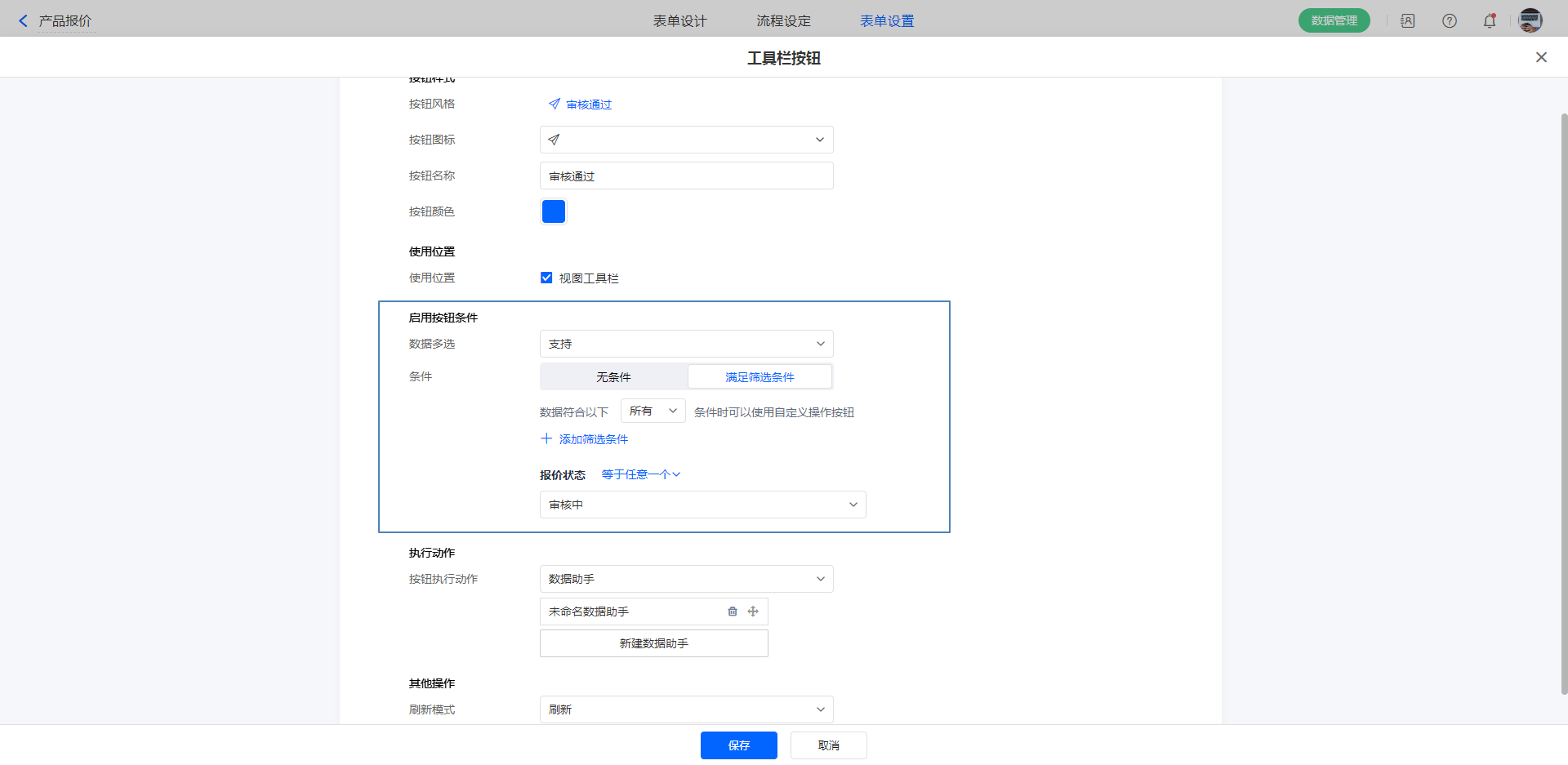 示例:工具栏按钮设置条件 报价状态 等于 审核中 ,执行动作配置助手(修改报价状态为 审核通过)。