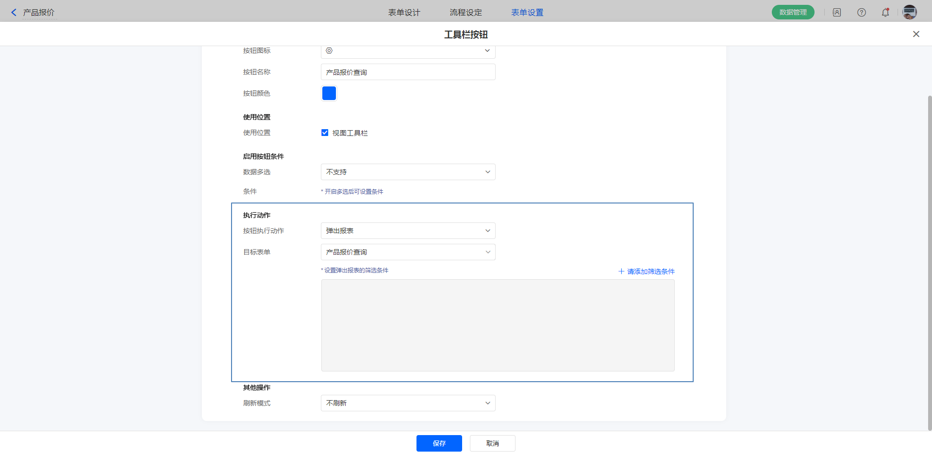 若设置了条件后,有满足条件的数据,才可使用自定义按钮,且执行按钮操作时,只将符合条件的数据传入。
