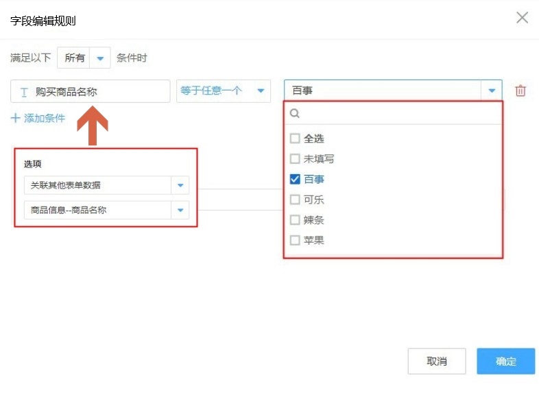 如下图中,【购买商品名称】字段关联【商品信息】表 的【商品名称】字段,在设置编辑规则时,可以直接联动出【商品信息】表中的数据进行条件设置。