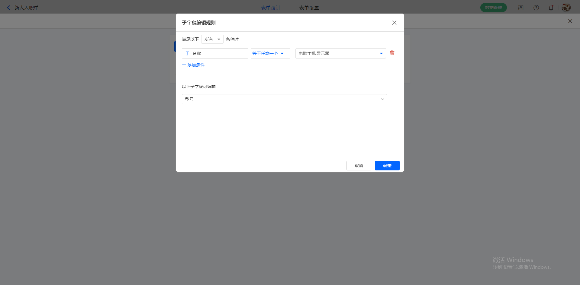 点击【添加编辑规则】,设置编辑条件为:满足【所有】条件时,【名称】等于【电脑】或【显示器】时,可以编辑【型号】,如下图所示: