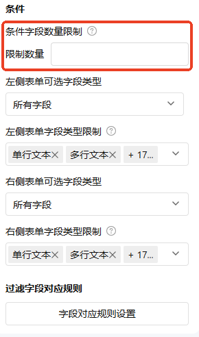 对过滤字段可以关联的其他字段进行限制,避免选择不被支持的字段(默认为同类型的字段,可以选择包含多个类型)。