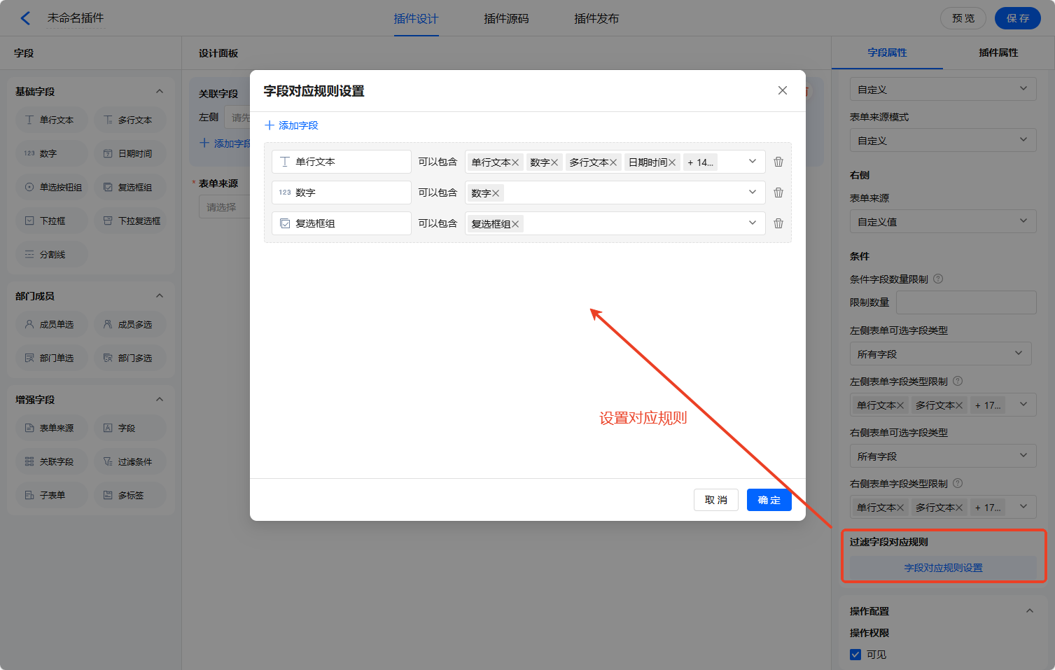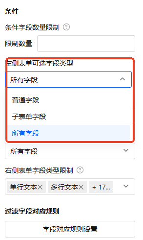 可选字段类型是限制当前表单的字段类型,可选字段类型目前支持:普通字段、子表单字段以及所有字段(子表单字段和普通字段)。