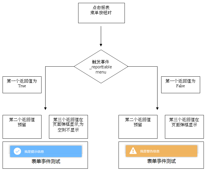 • 第三个返回值是字符串(可选),返回给页面弹出提示。 (如果没有返回值时第一个返回值默认为True(真),第二/三个返回值默认为空)