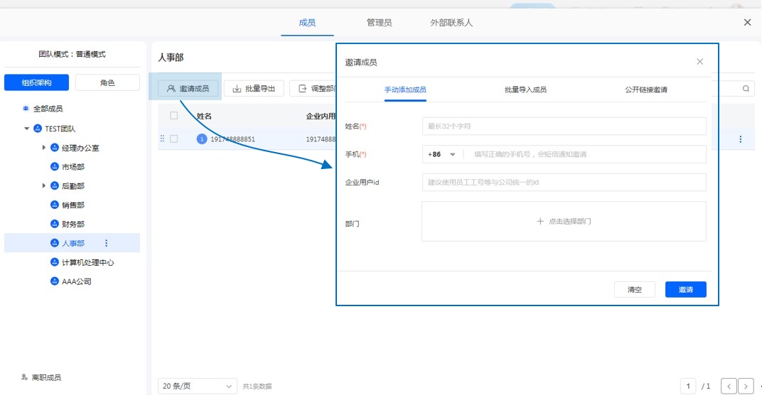 管理员可在通讯录中,使用手动添加功能,输入团队成员的手机号,根据成员的注册情况,自动发送短信或站内信,成员通过点击链接加入团队。