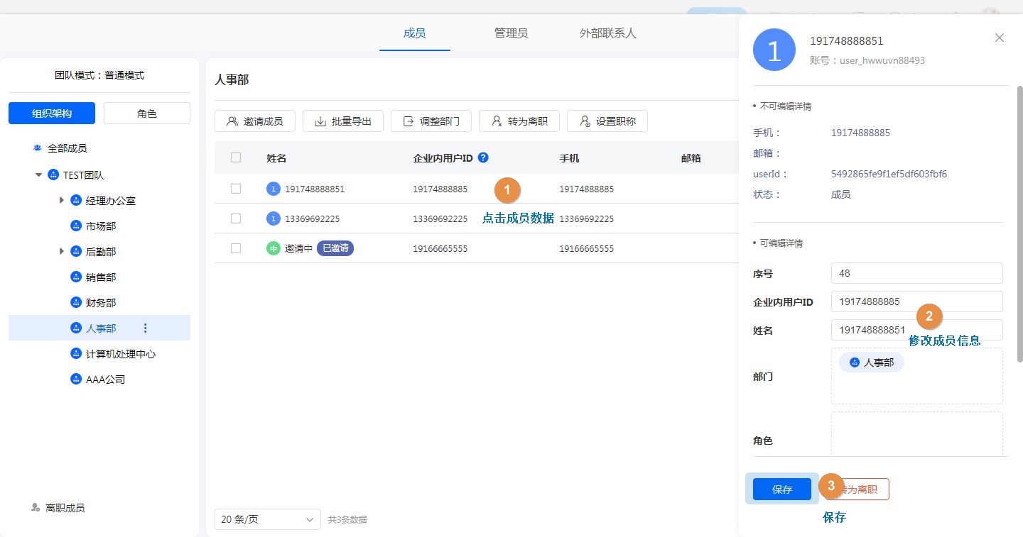 管理员可对成员的企业内ID、姓名、部门、角色、职称、备注进行更改。