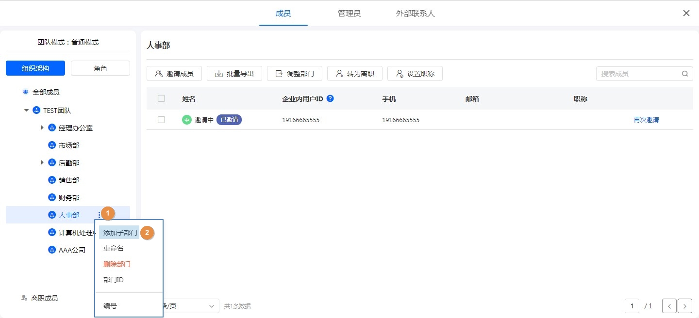 在普通团队模式下,管理员可直接对通讯录进行管理,包括部门的创建、删除、修改等;对成员的部门调整、设置部门主管、编辑信息等。