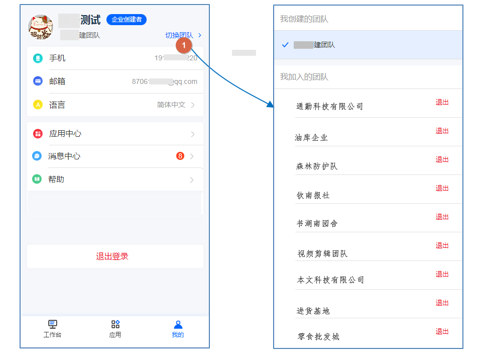 在个人中心可查看个人信息和团队信息,并且可以进行团队的切换。