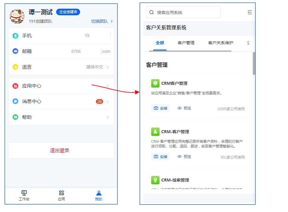 移动端的个人中心[即:我的]内可对当前账号进行管理,并可进行应用的安装和管理。