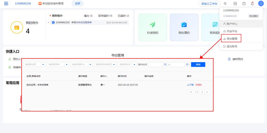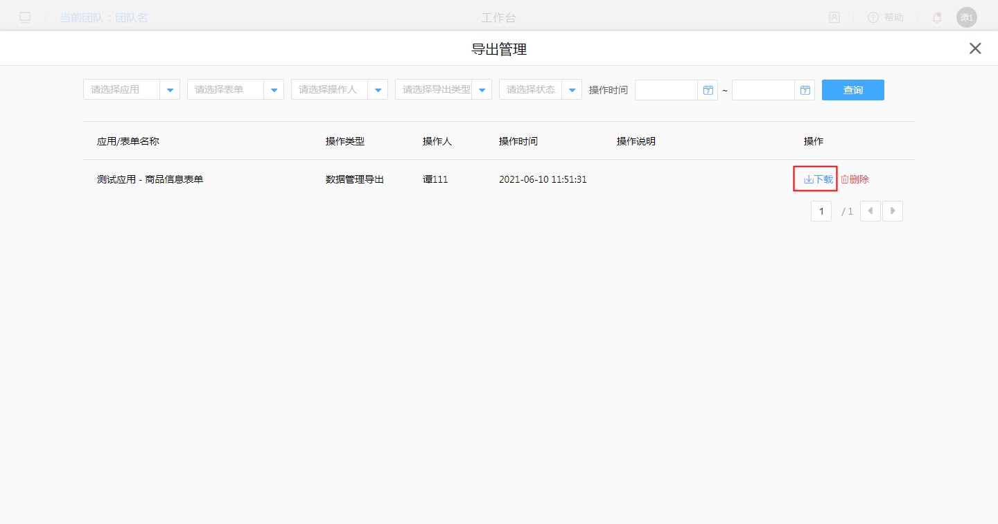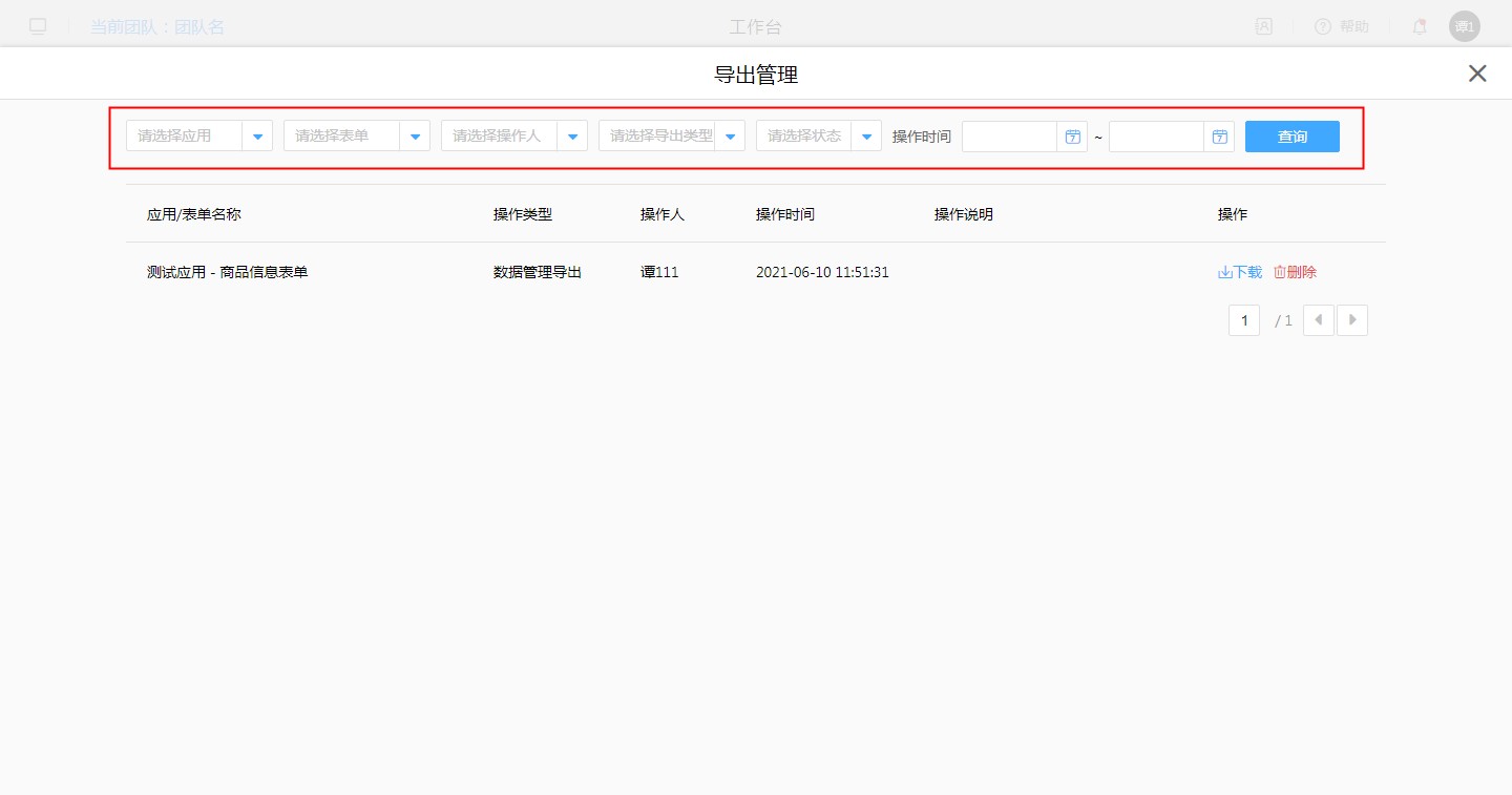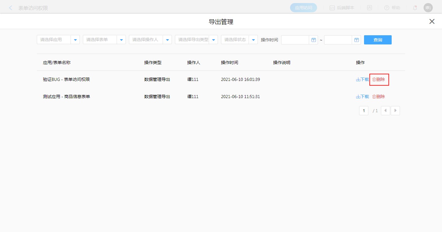 导出管理页面记录了在系统数据管理导出、附件批量导出、新报表-数据表导出、新报表-透视图导出、安装包导出日志。