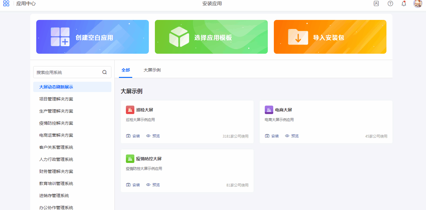- 选择应用模板,安装应用中心应用,直接使用。 为了减轻用户自己设计应用的难度,我们还提供了各行各业的模板应用供参考。