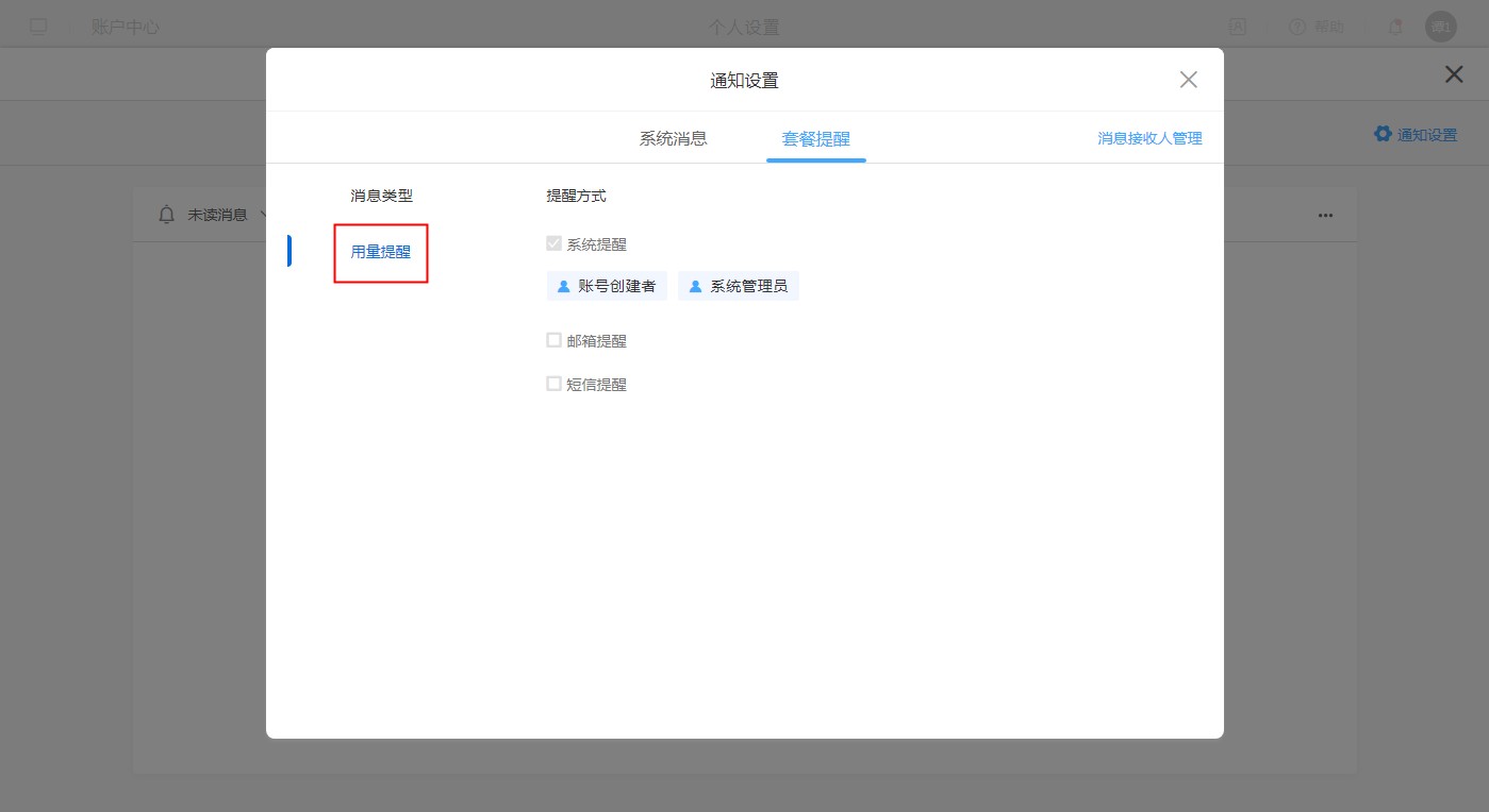- 设置方式:勾选短信提醒方式,默认发送给账号创建者,还可以设置接收人,接收人可以在消息接收人管理中设置。