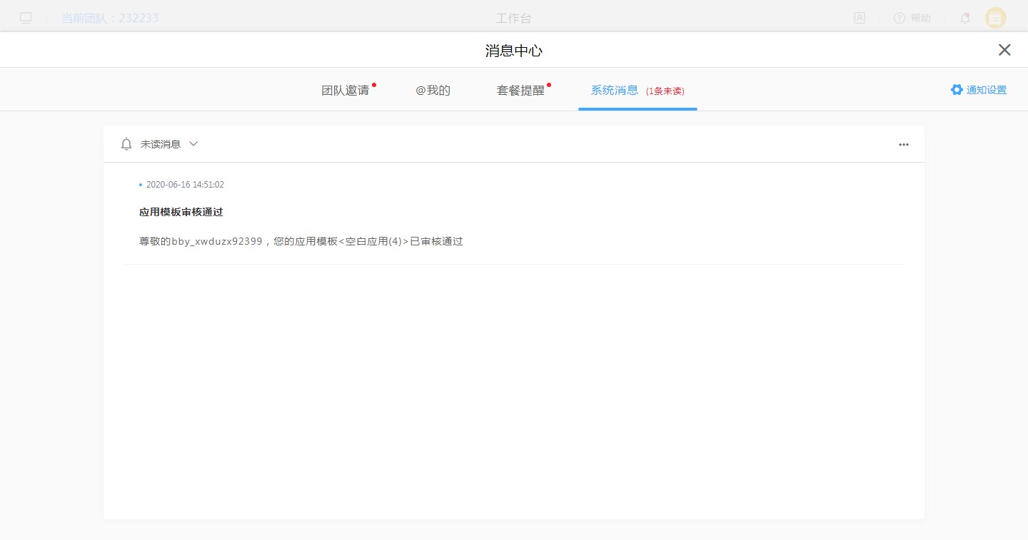系统消息包括数据视图执行失败、模块审核、应用审核等审核通过或失败的消息以及数据视图执行失败的消息。具体的提醒方式可在通知设置处进行设置。