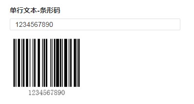 | 10、条形码图片 | 输入字符串后,自动转化为条形码展示在输入框下方 子表单中,单行文本字段不支持此格式。 中文不支持转换为条形码。 |