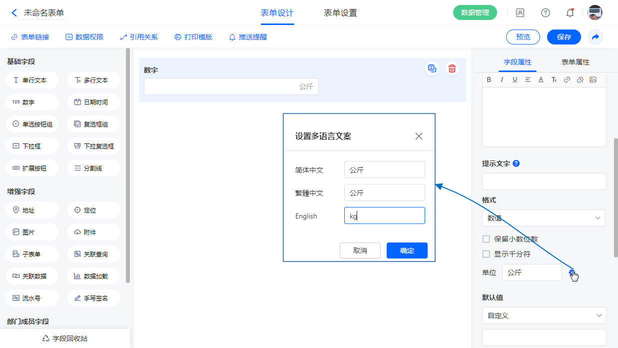 “数字”是用于表单中数值记录或计算的场景,只允许输入数值类的值。