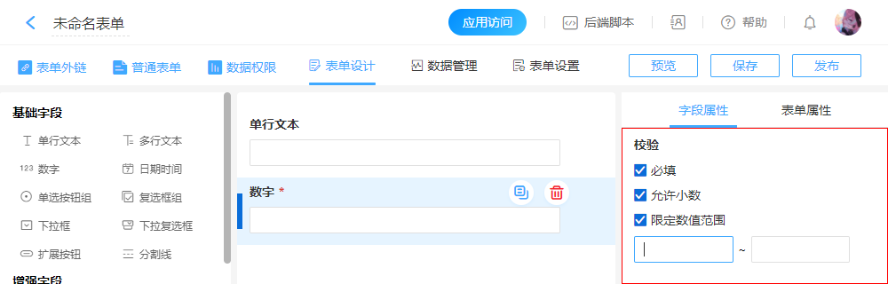 | 限定数值范围 | 勾选启用,只允许填写设定范围的数值,否则拦截提交。 |
