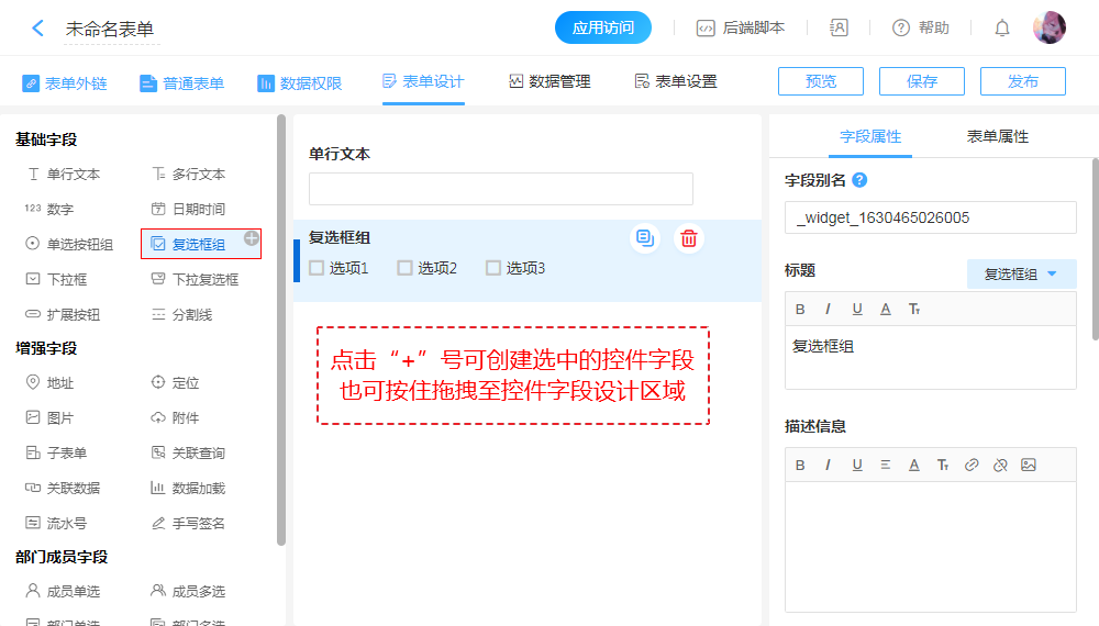“字段别名”用于后端开发,默认为系统自动生成的随机字符串,可修改。