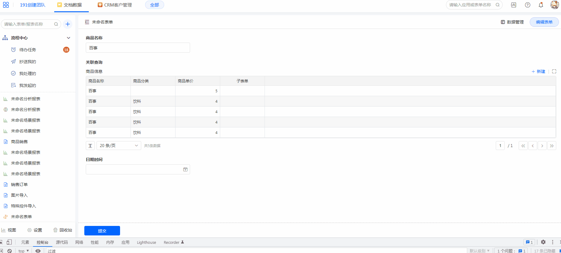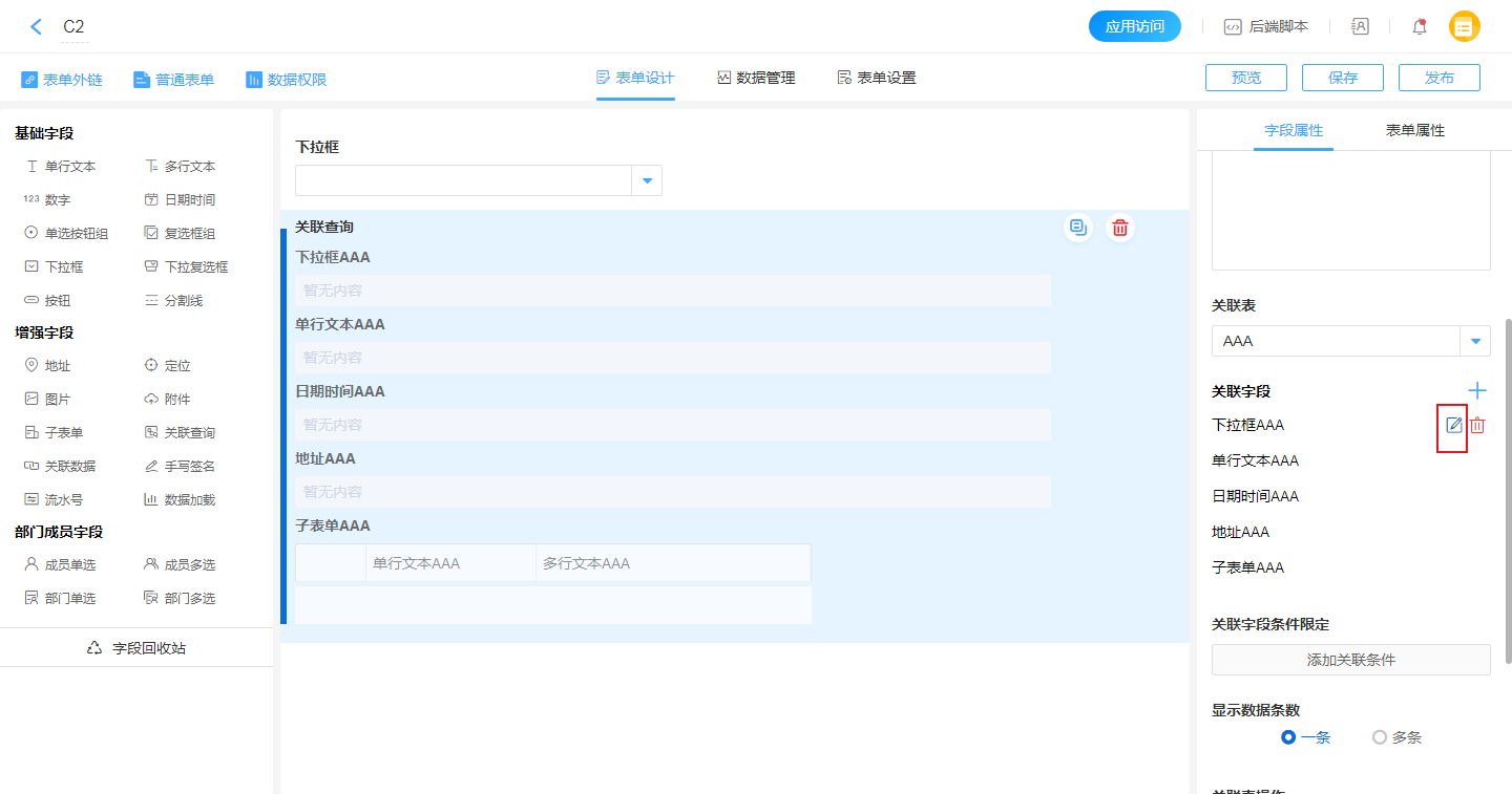 - 在表单设计页,预览和数据管理中,不可新增和查看关联表的数据。