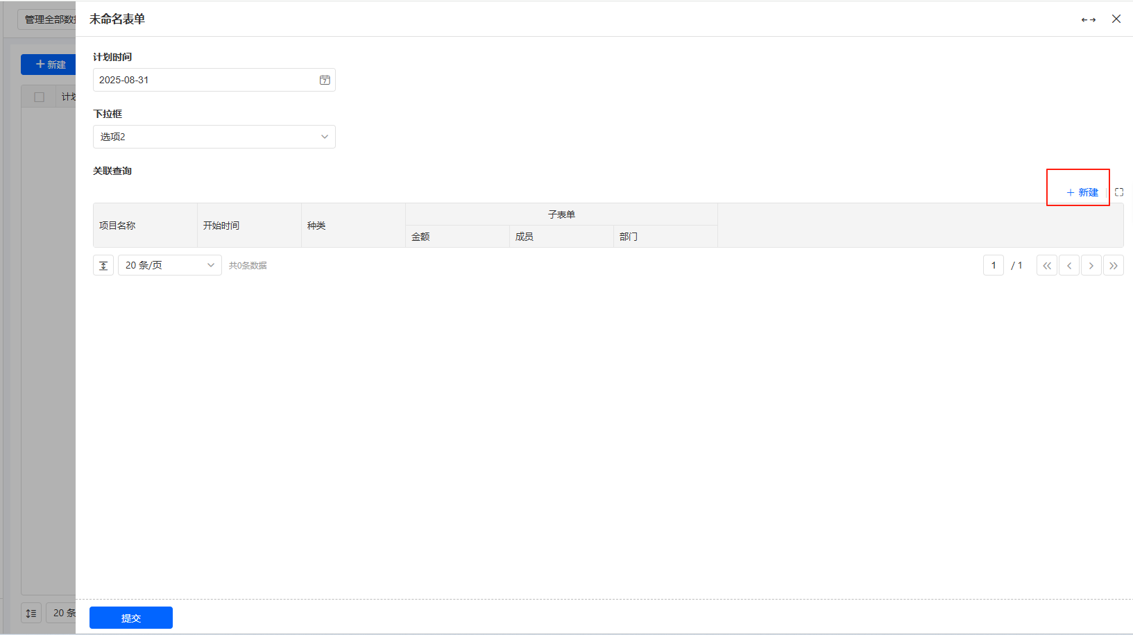 “多条”数据模式下,可设置“允许新增关联表数据”,通过点击关联查询字段的右上方""新建"可弹出被关联的表单进行新增数据。
